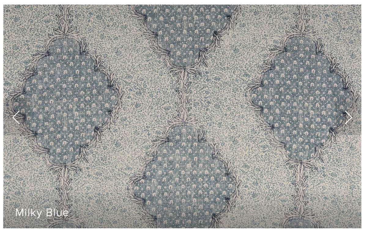 Made of: 100% linenRepeat: 18”H x 30"VWidth: 54"Available Colors: Desert Rose, Milky Blue, Mossy Green