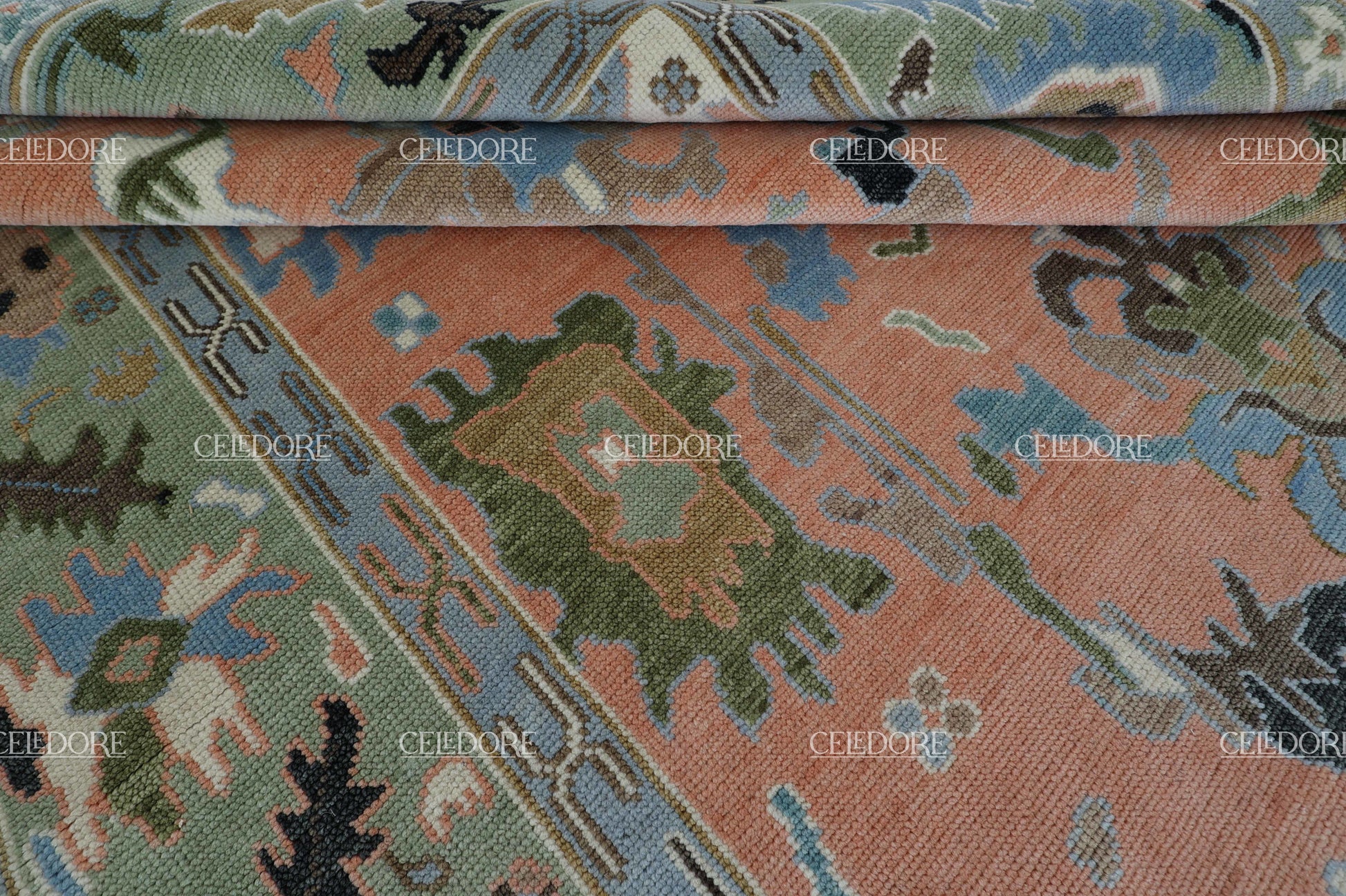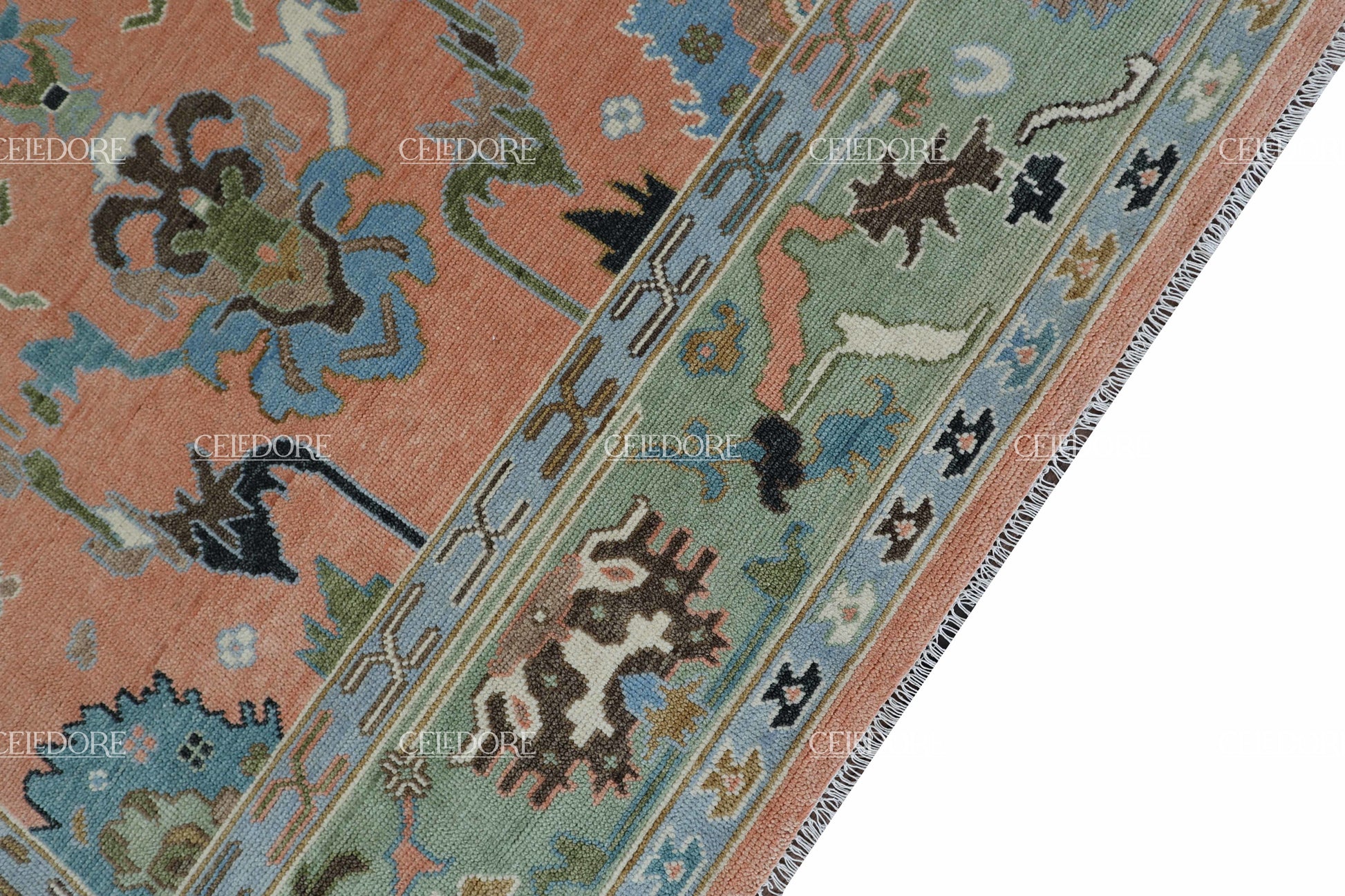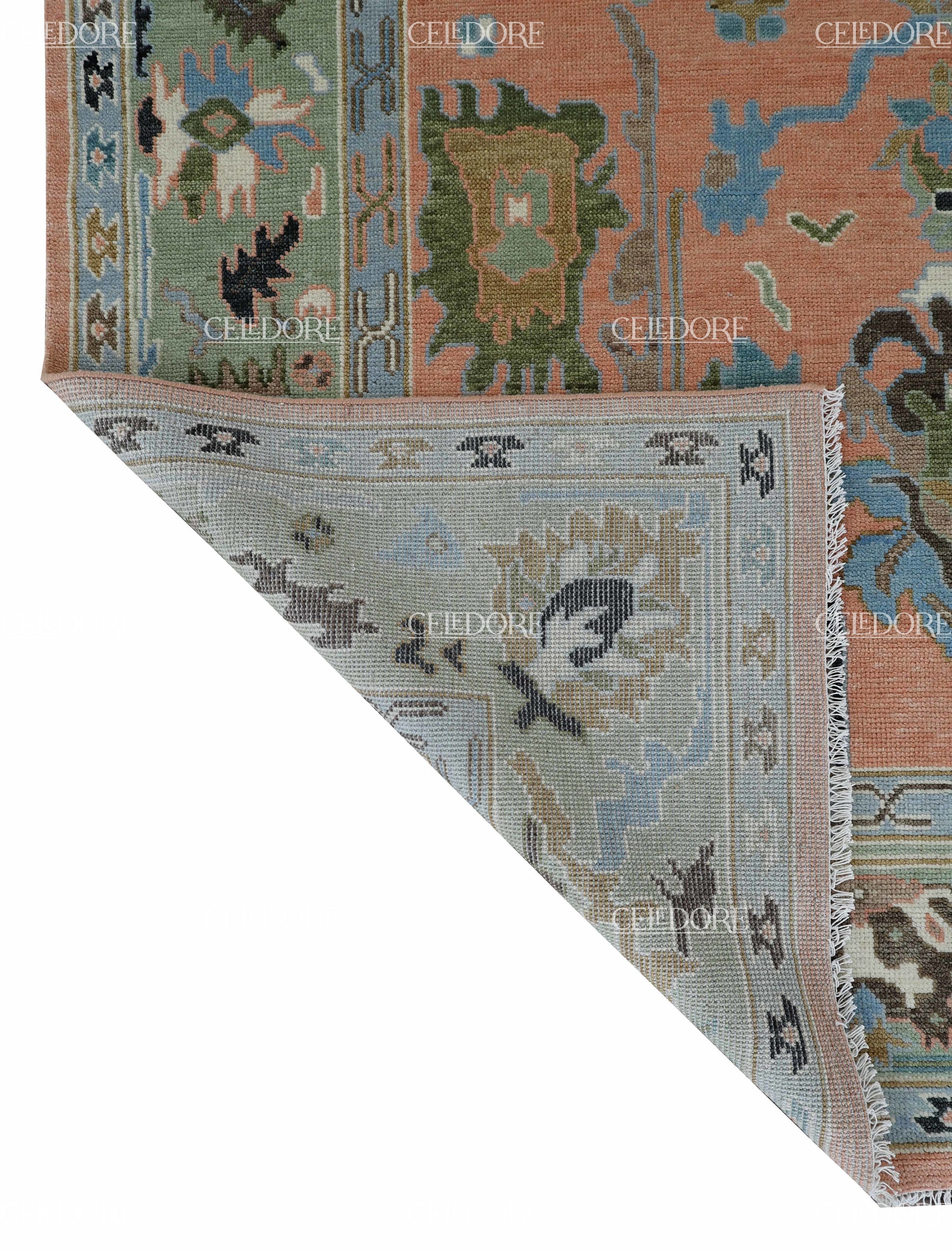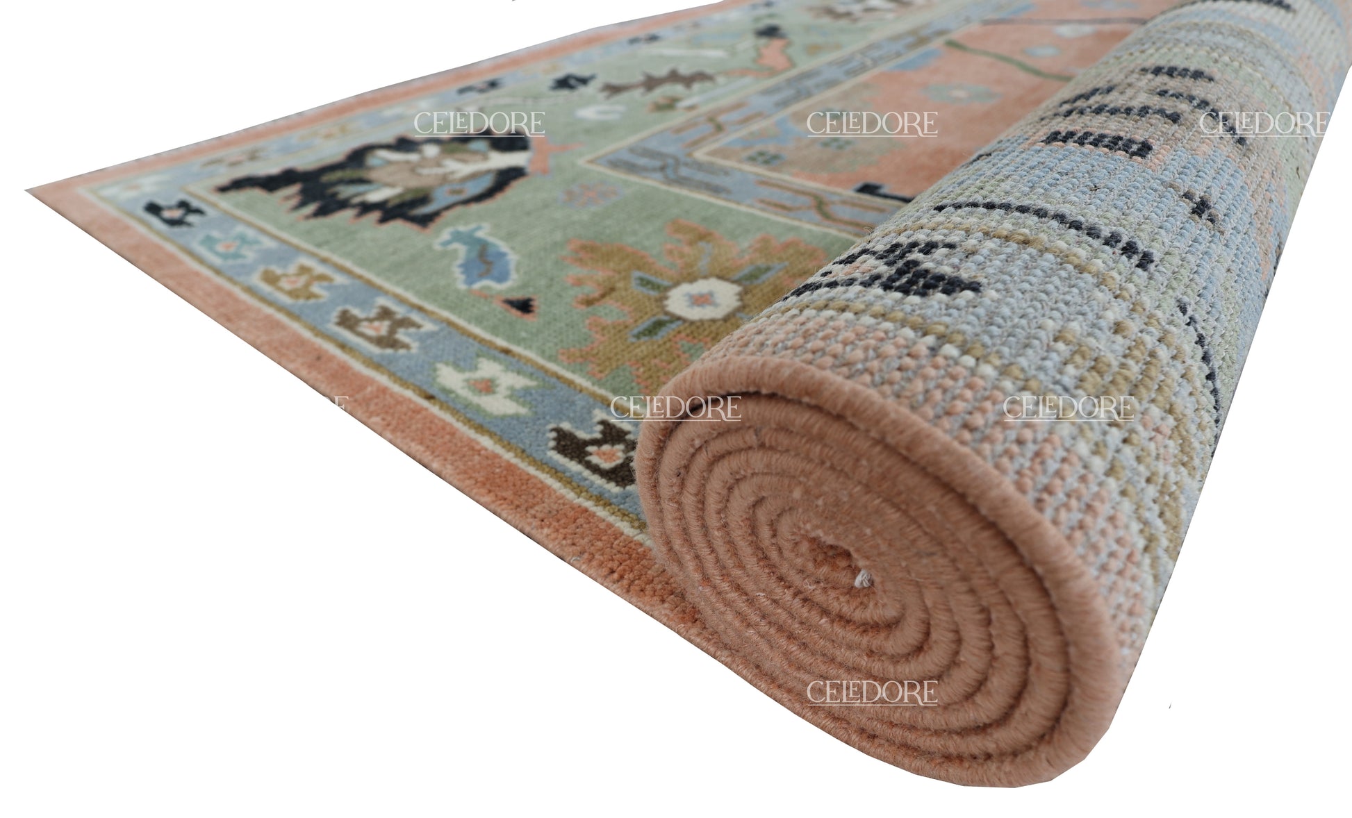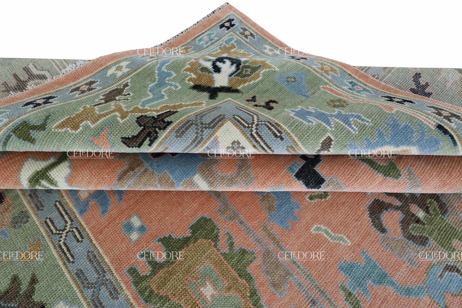 Hand-Knotted Oushak Rug, meticulously crafted with the finest quality wool. This rug embodies the rich tapestry of Indian craftsmanship, blending traditional design with a contemporary twist, reminiscent of the vibrant villages of India.