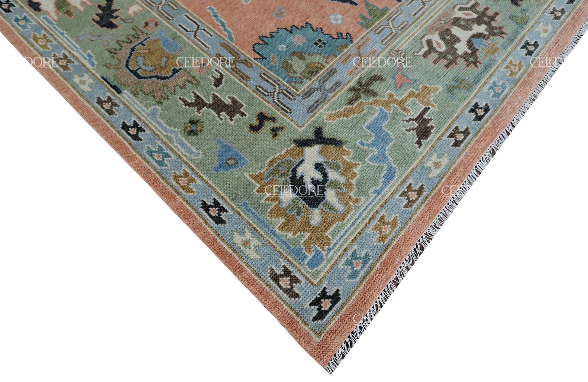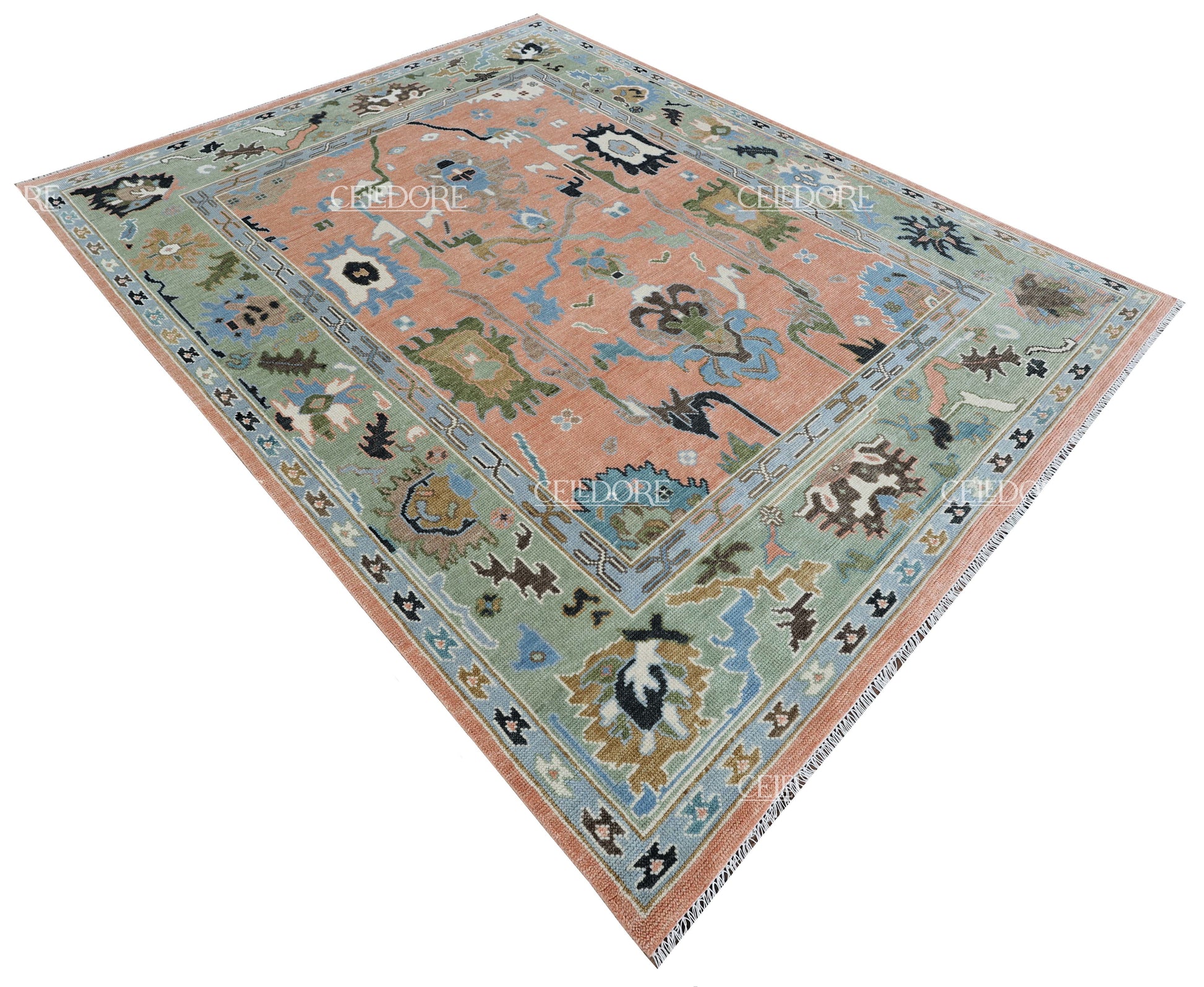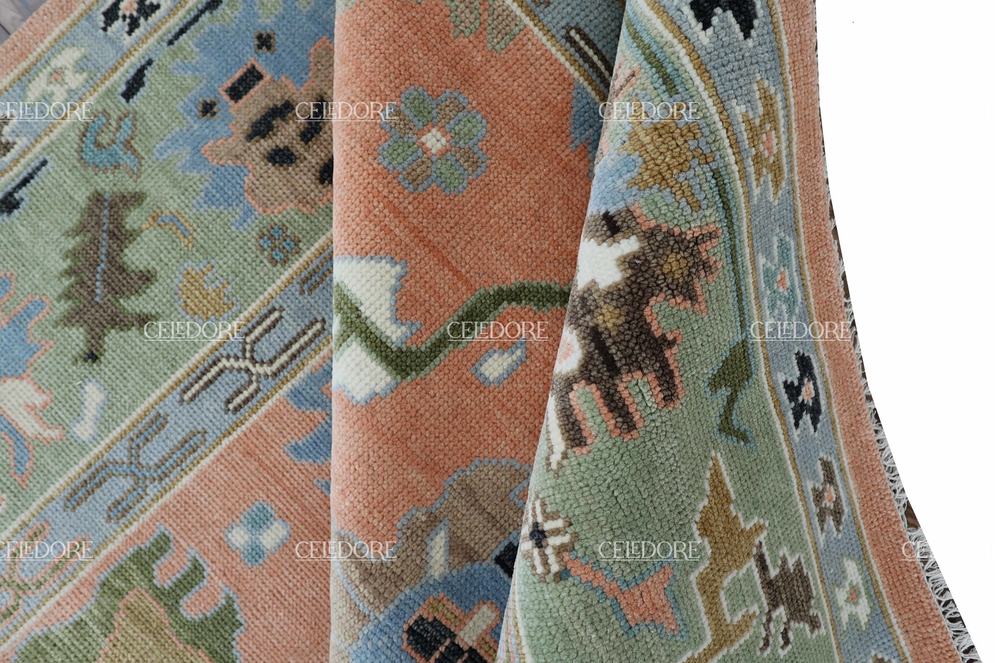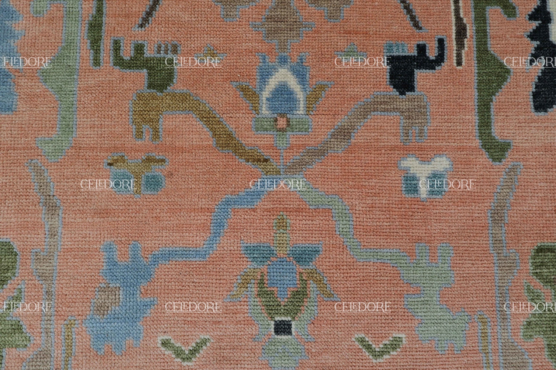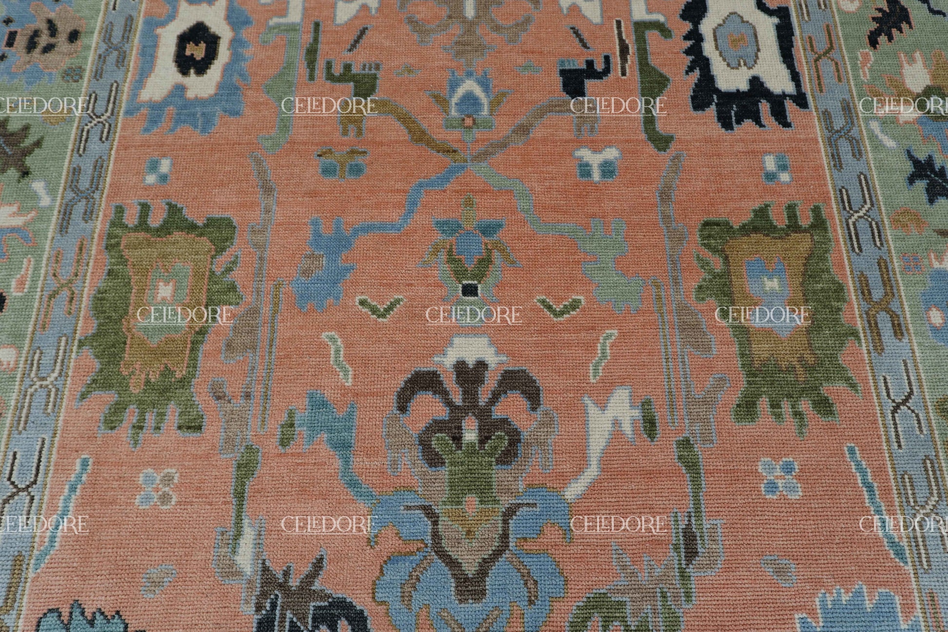 Hand-Knotted Oushak Rug, meticulously crafted with the finest quality wool. This rug embodies the rich tapestry of Indian craftsmanship, blending traditional design with a contemporary twist, reminiscent of the vibrant villages of India.