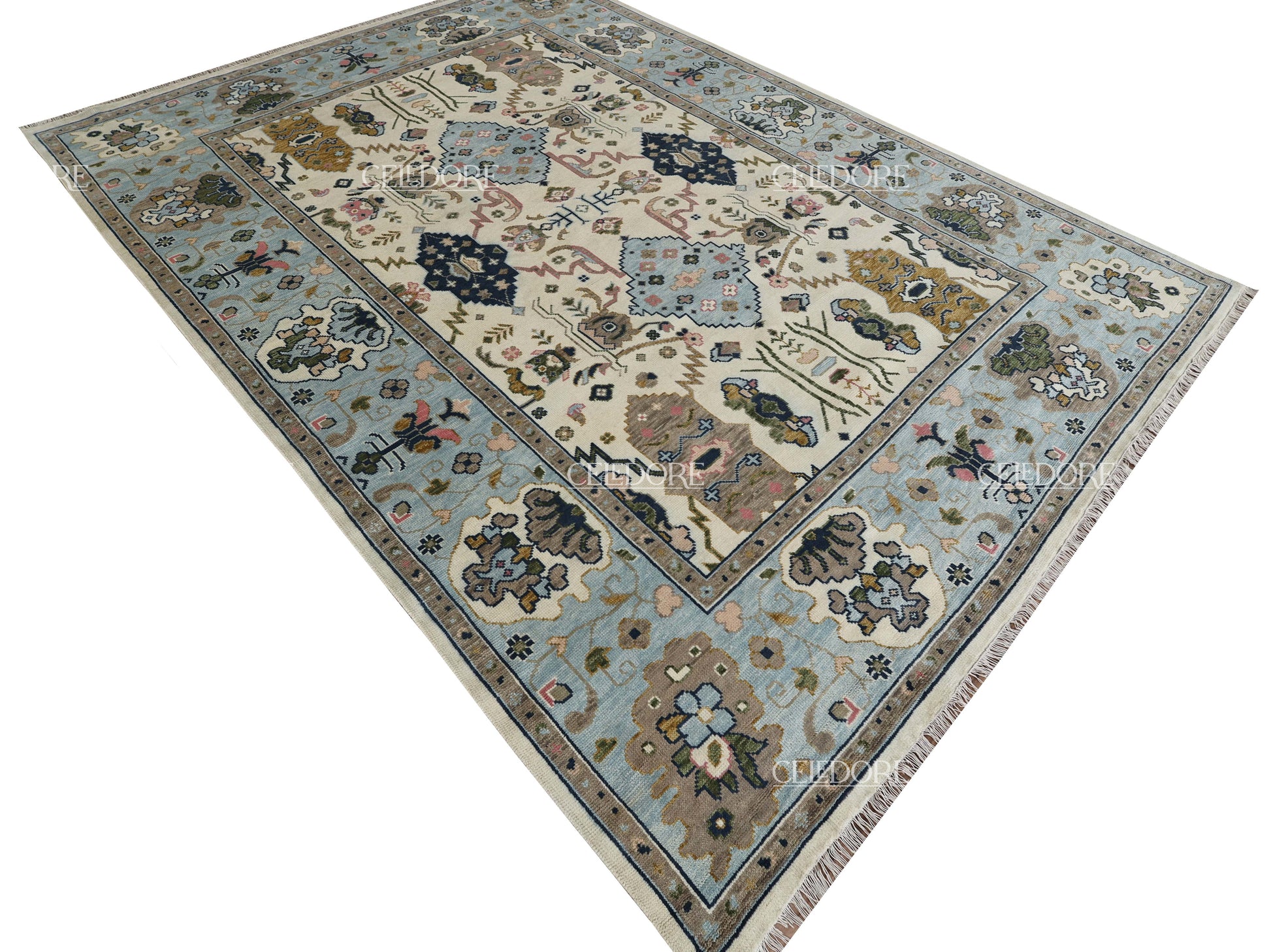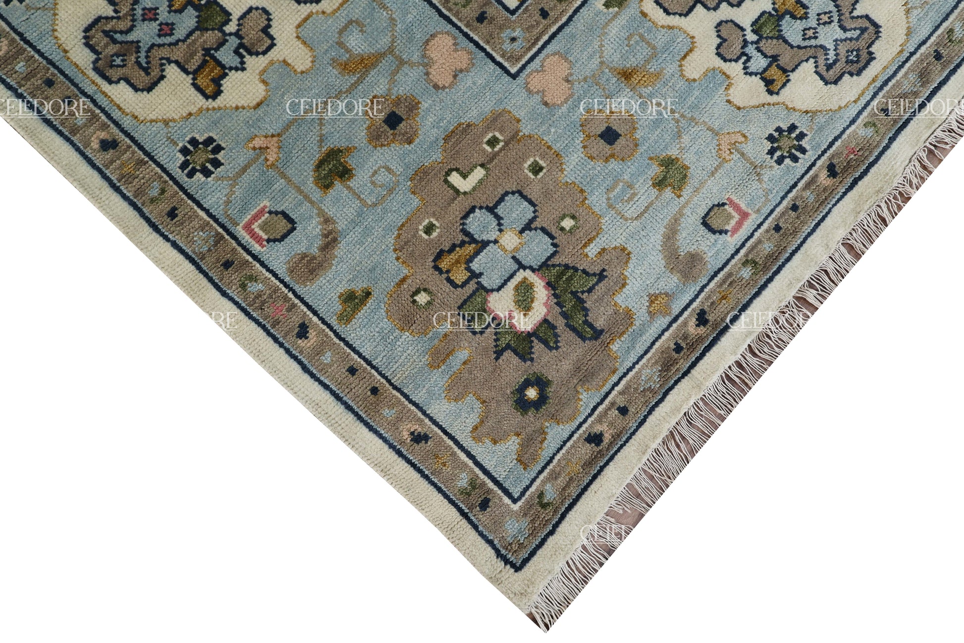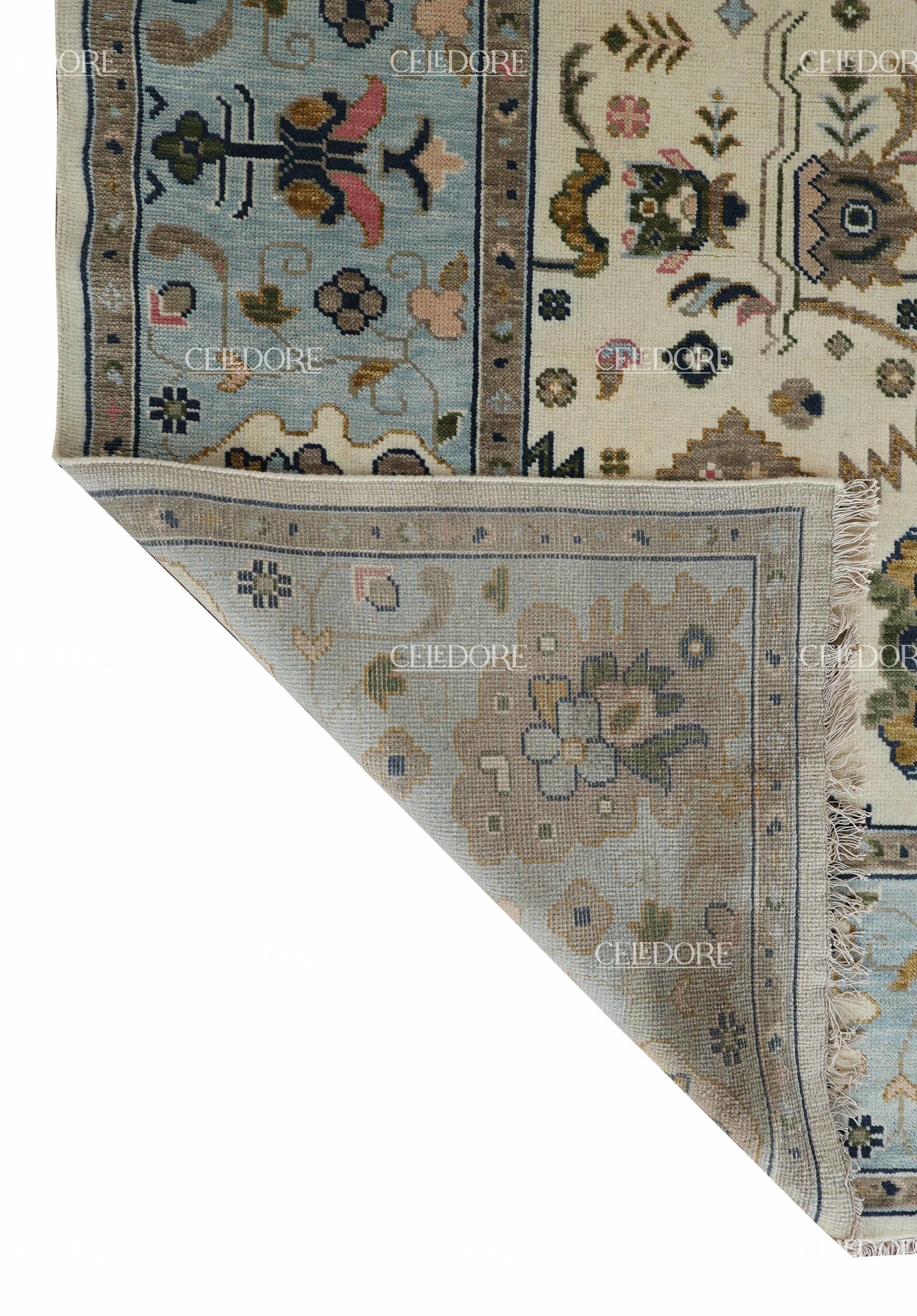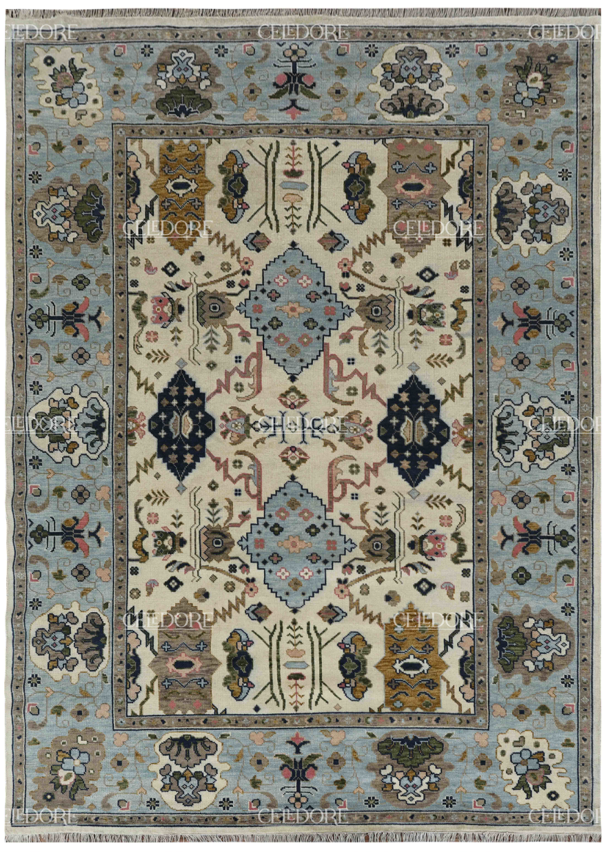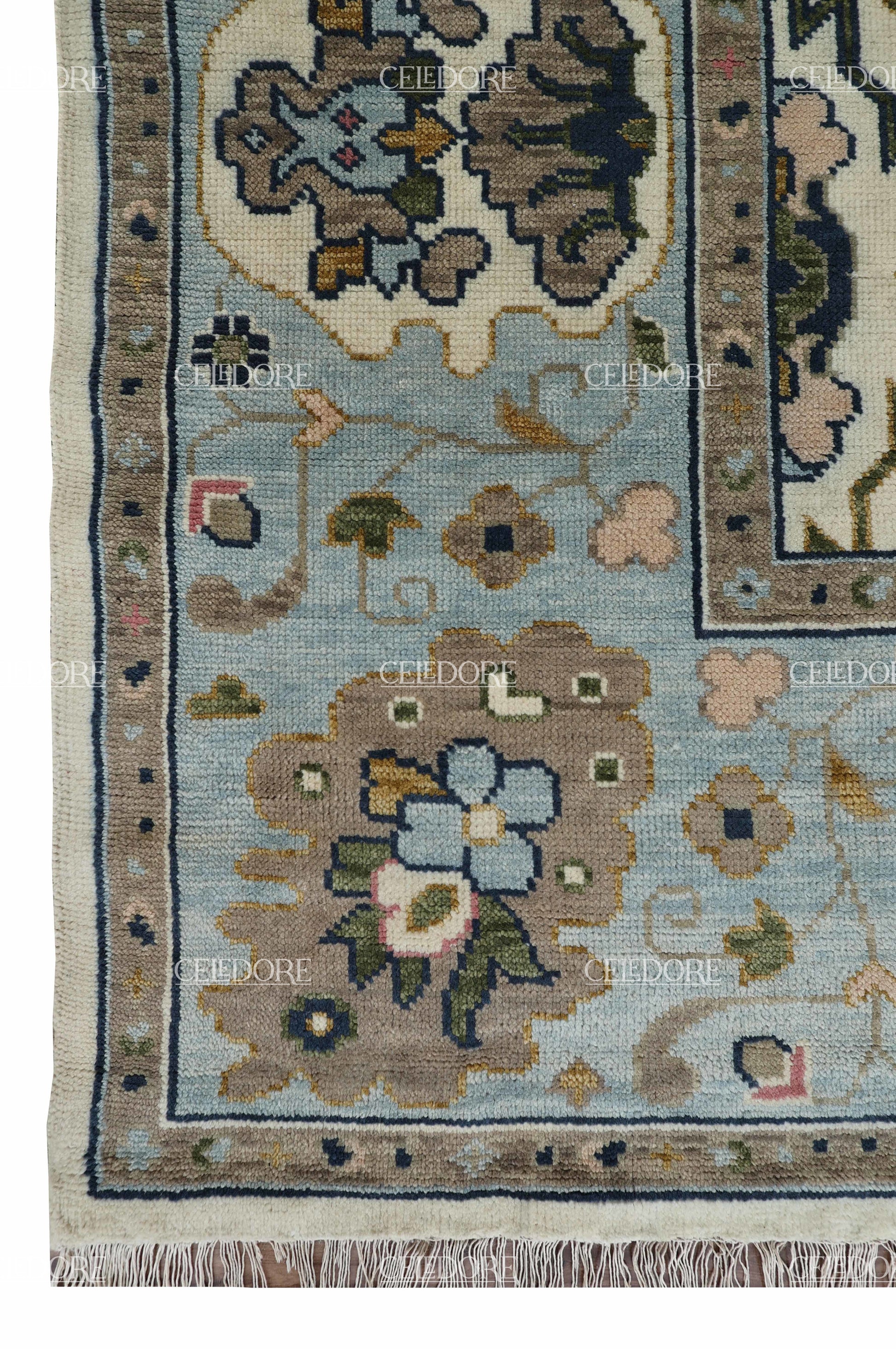 Hand-Knotted Oushak Rug, meticulously crafted with the finest quality wool. This rug embodies the rich tapestry of Indian craftsmanship, blending traditional design with a contemporary twist, reminiscent of the vibrant villages of India.