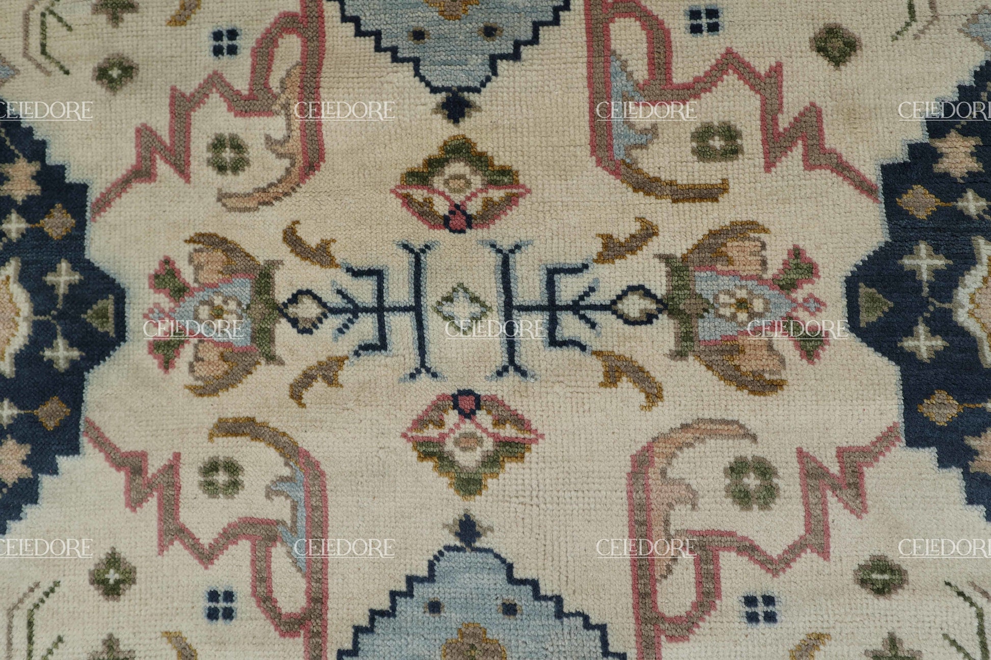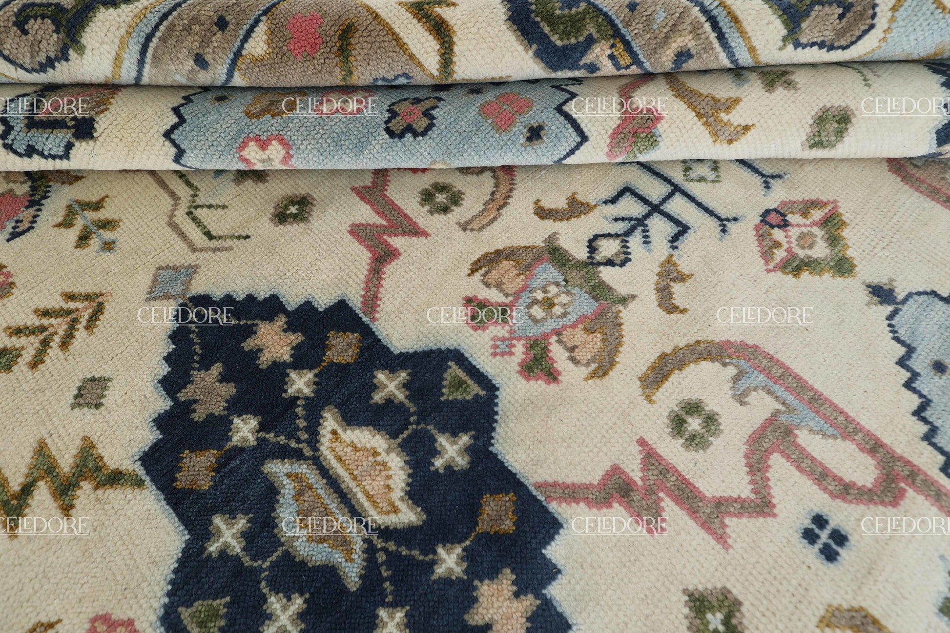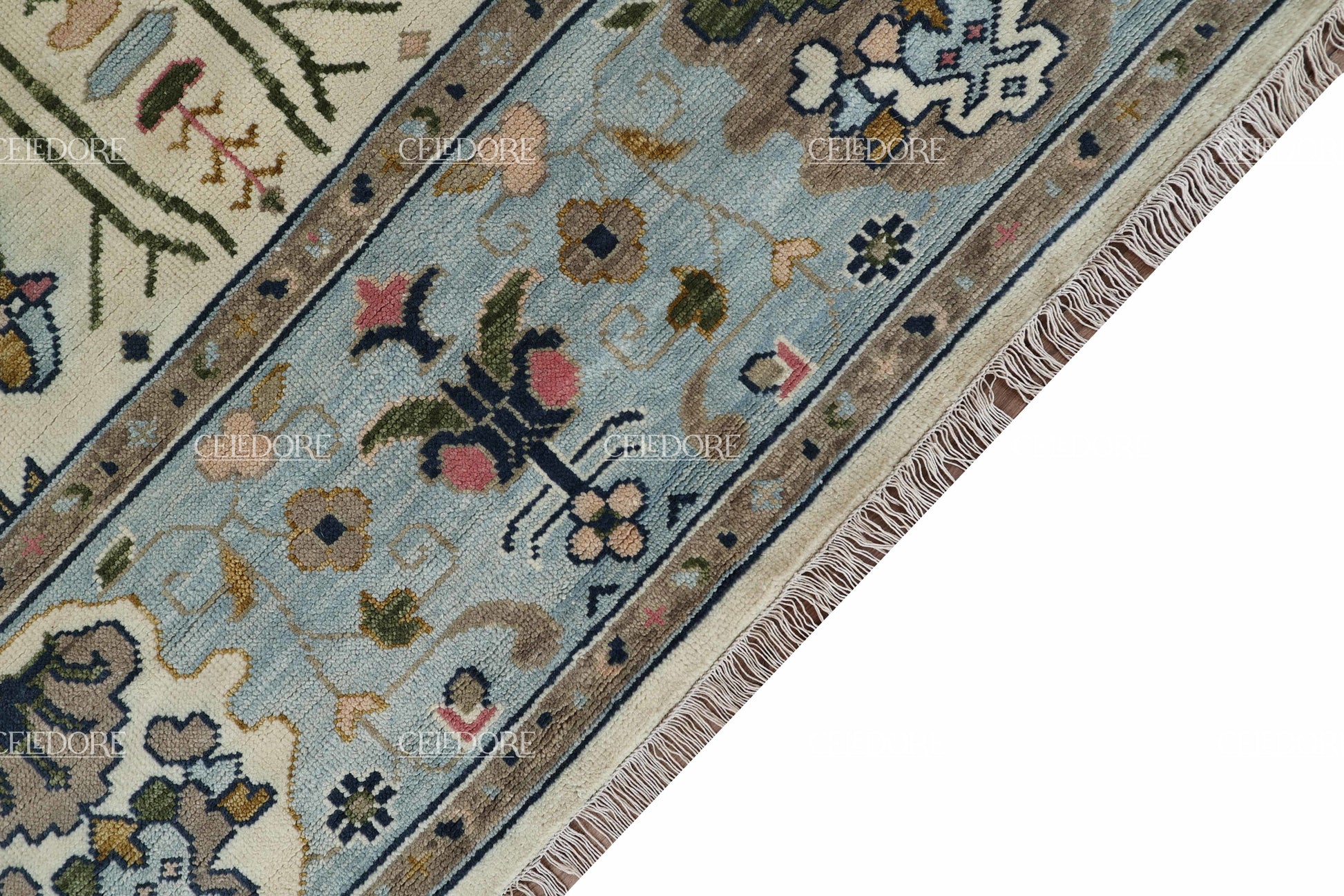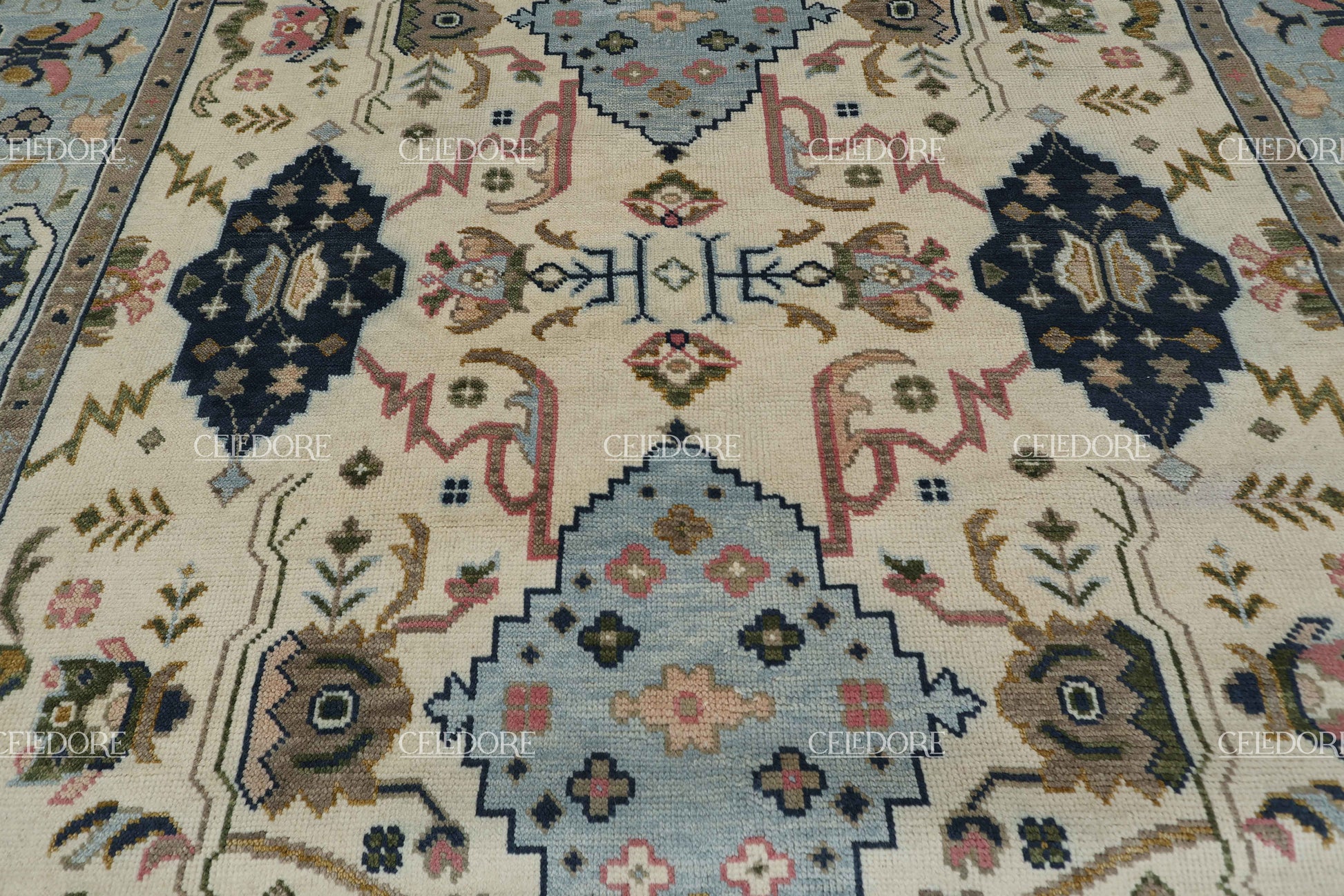 Hand-Knotted Oushak Rug, meticulously crafted with the finest quality wool. This rug embodies the rich tapestry of Indian craftsmanship, blending traditional design with a contemporary twist, reminiscent of the vibrant villages of India.