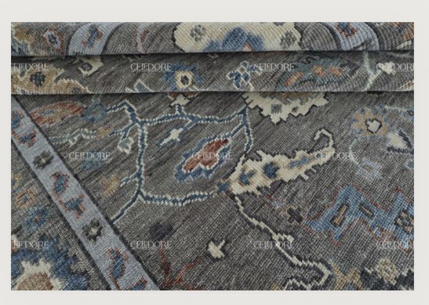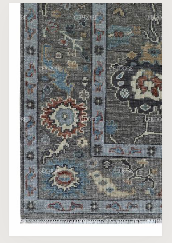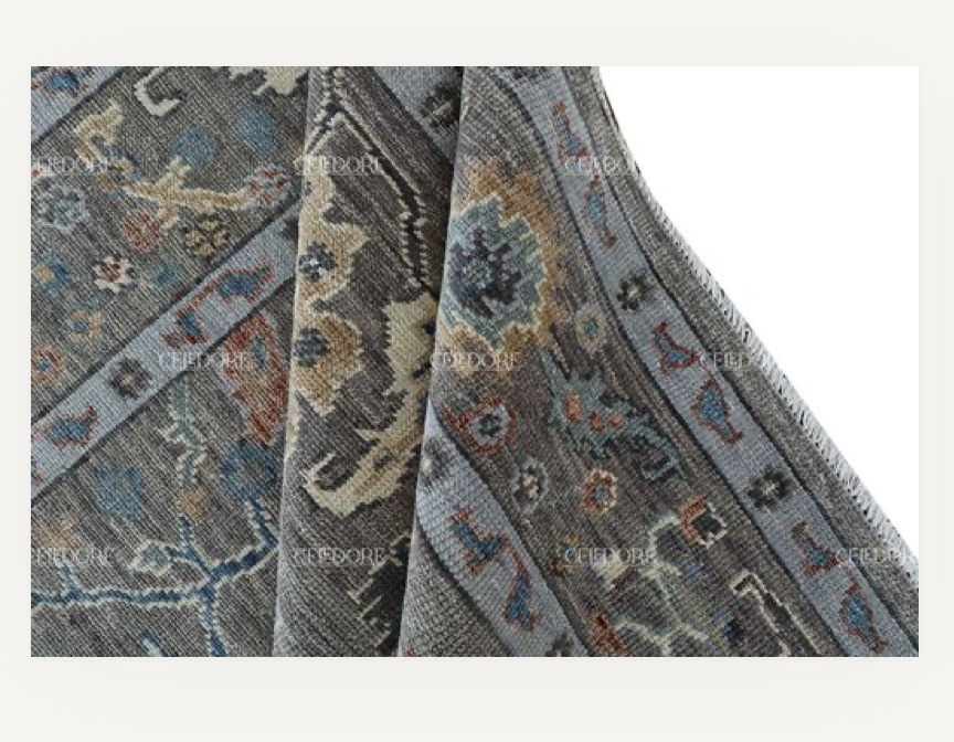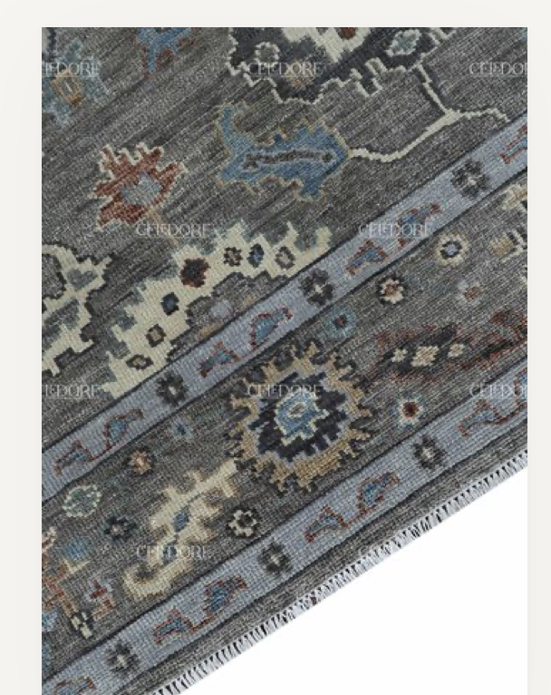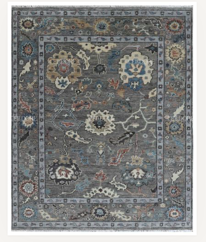 Hand-Knotted Oushak Rug, meticulously crafted with the finest quality wool. This rug embodies the rich tapestry of Indian craftsmanship, blending traditional design with a contemporary twist, reminiscent of the vibrant villages of India.