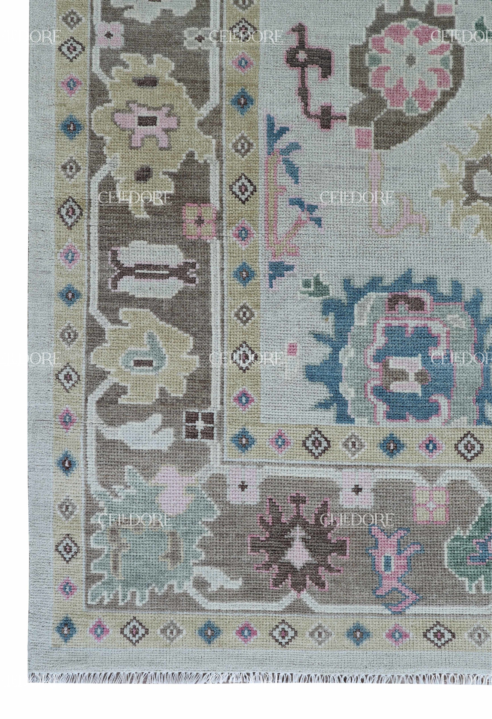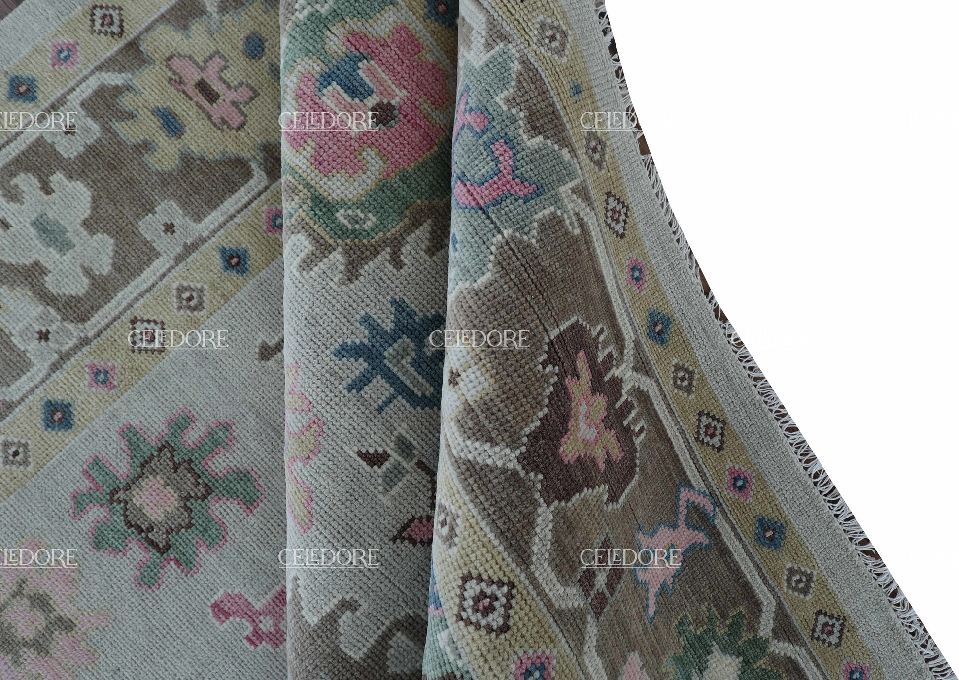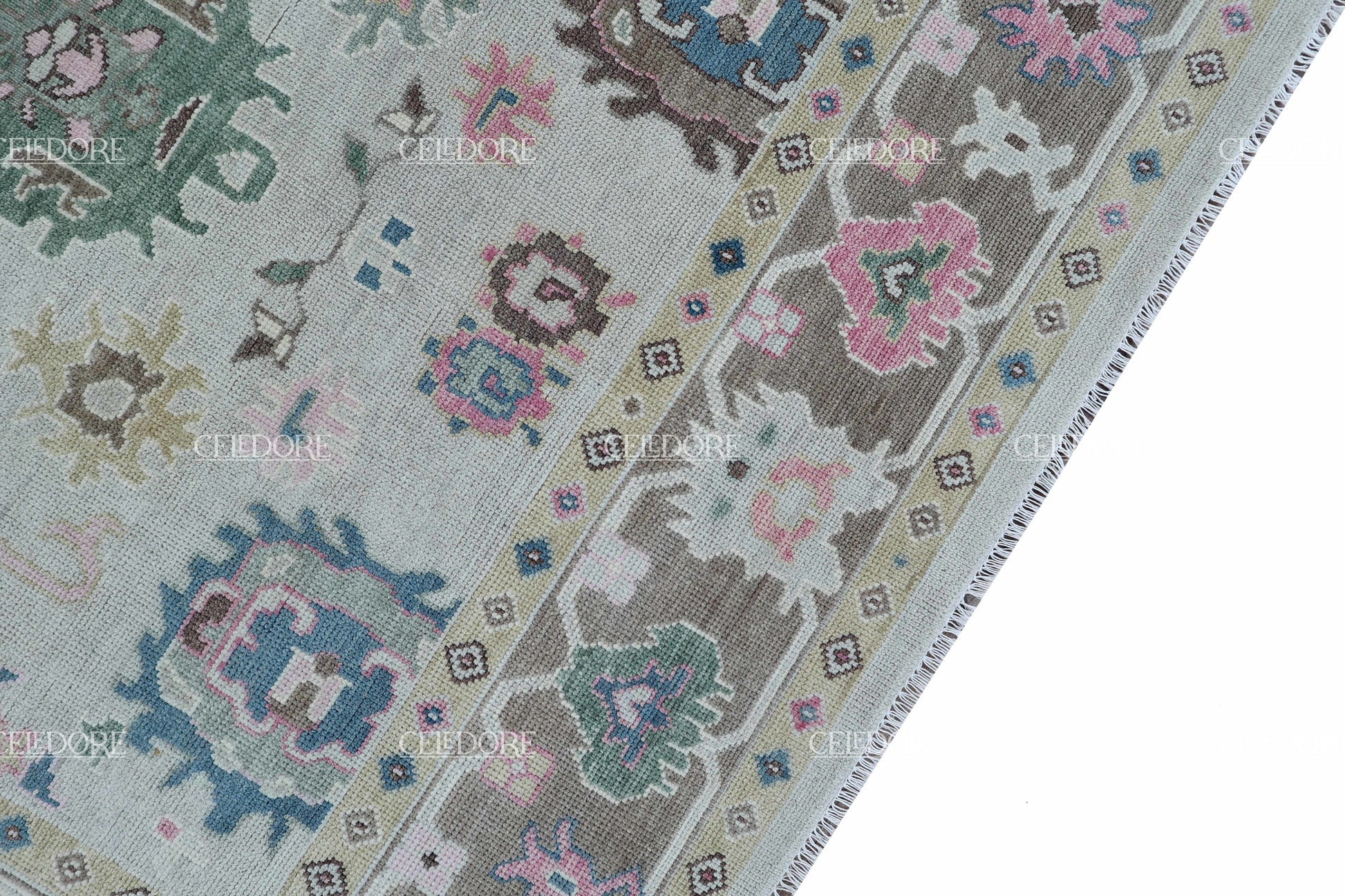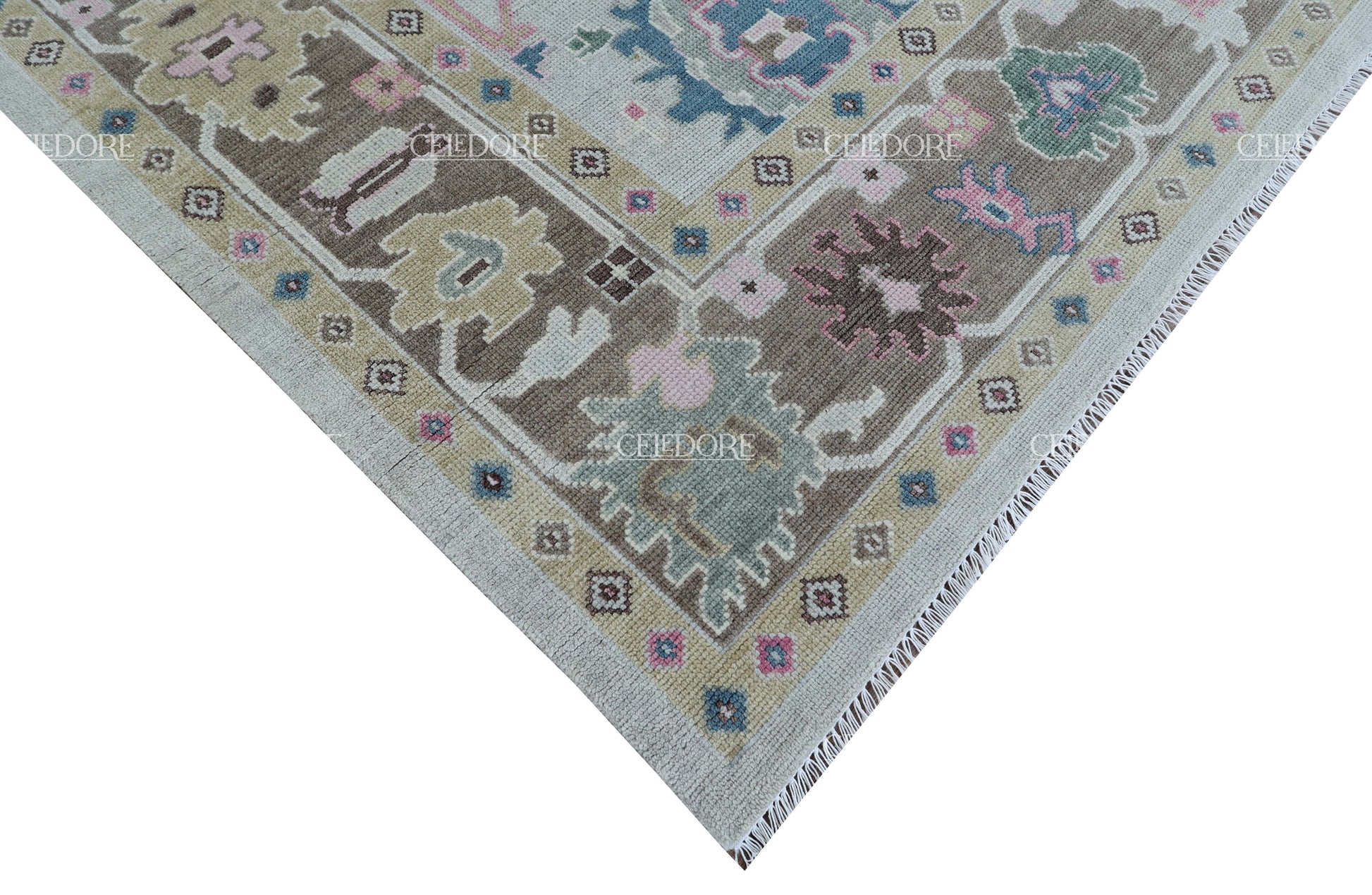 Hand-Knotted Oushak Rug, meticulously crafted with the finest quality wool. This rug embodies the rich tapestry of Indian craftsmanship, blending traditional design with a contemporary twist, reminiscent of the vibrant villages of India.