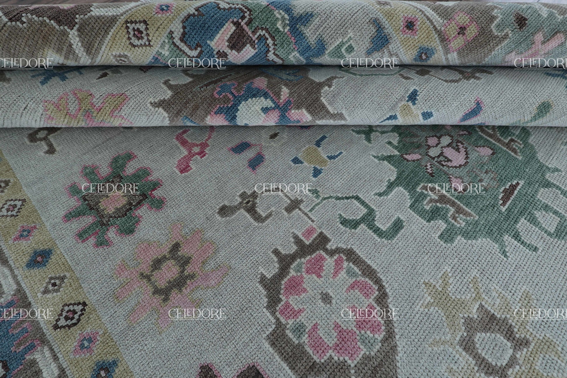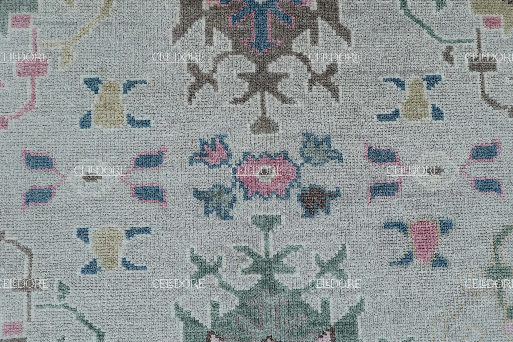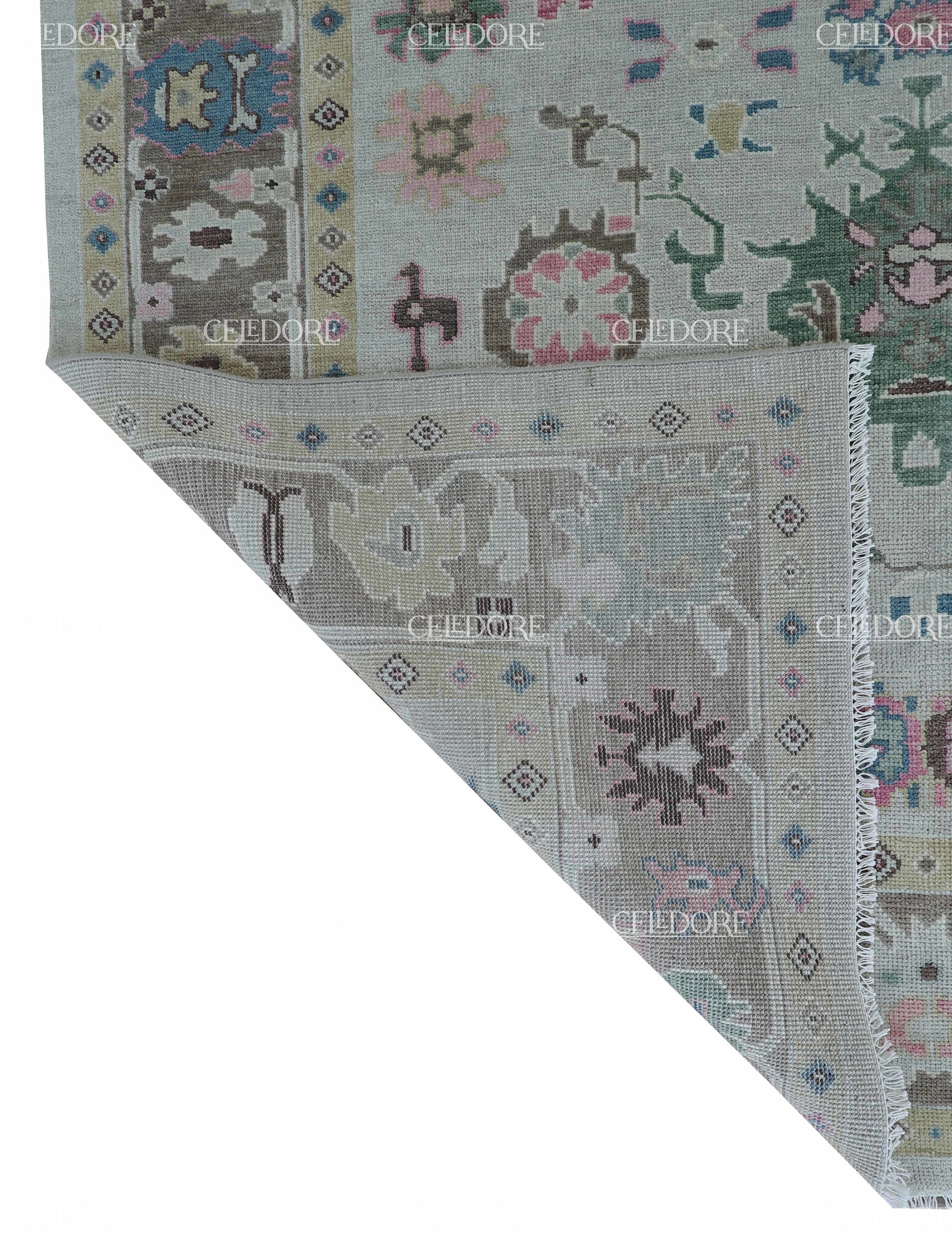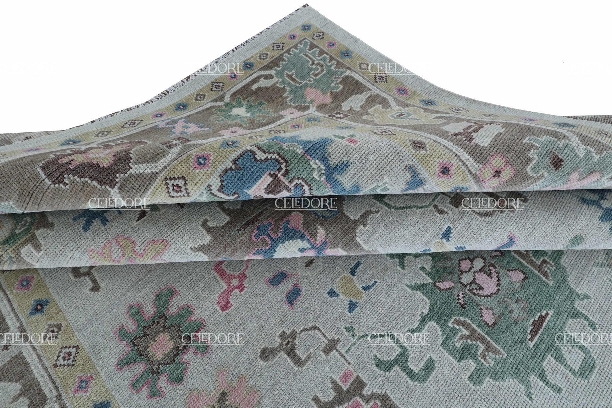 Hand-Knotted Oushak Rug, meticulously crafted with the finest quality wool. This rug embodies the rich tapestry of Indian craftsmanship, blending traditional design with a contemporary twist, reminiscent of the vibrant villages of India.
