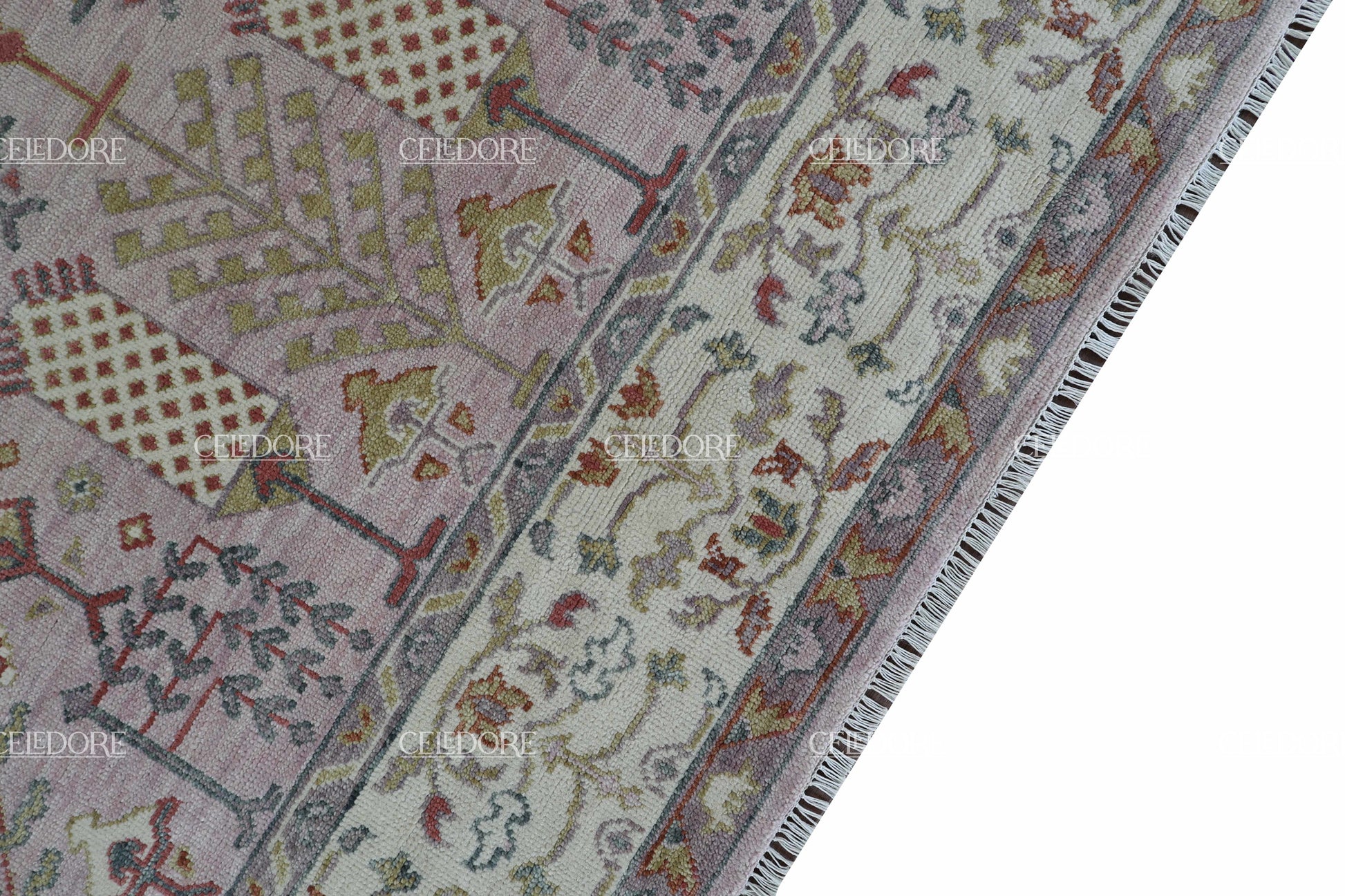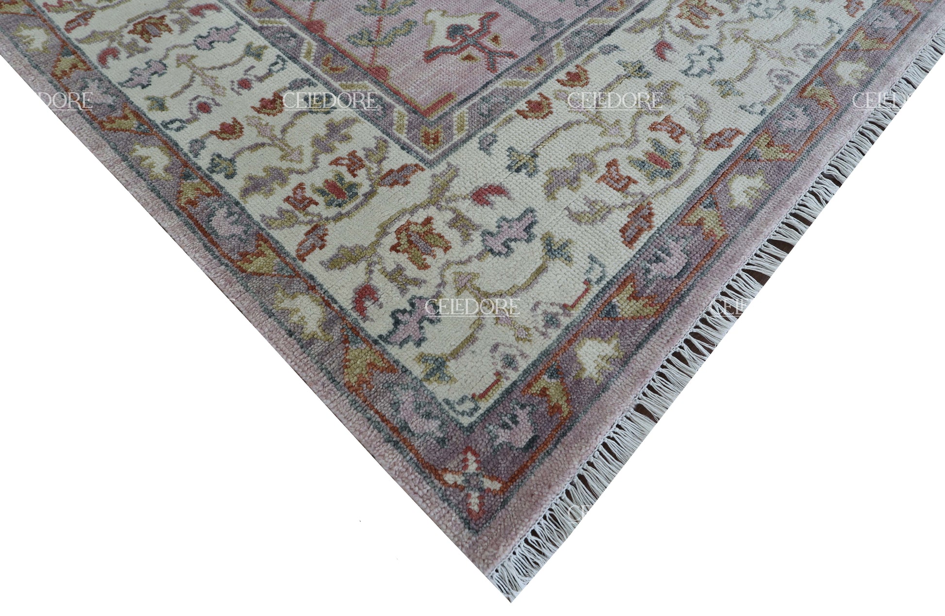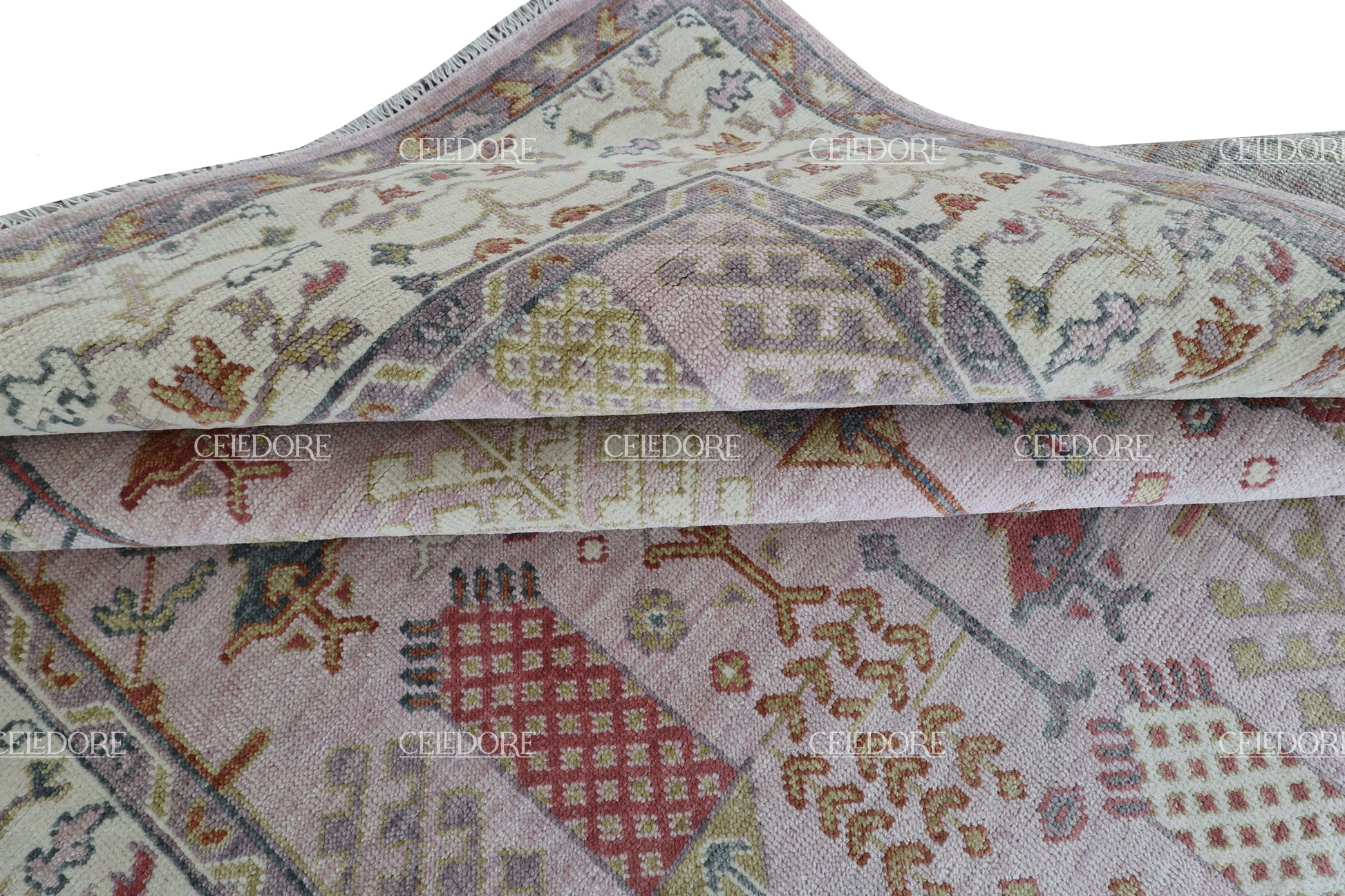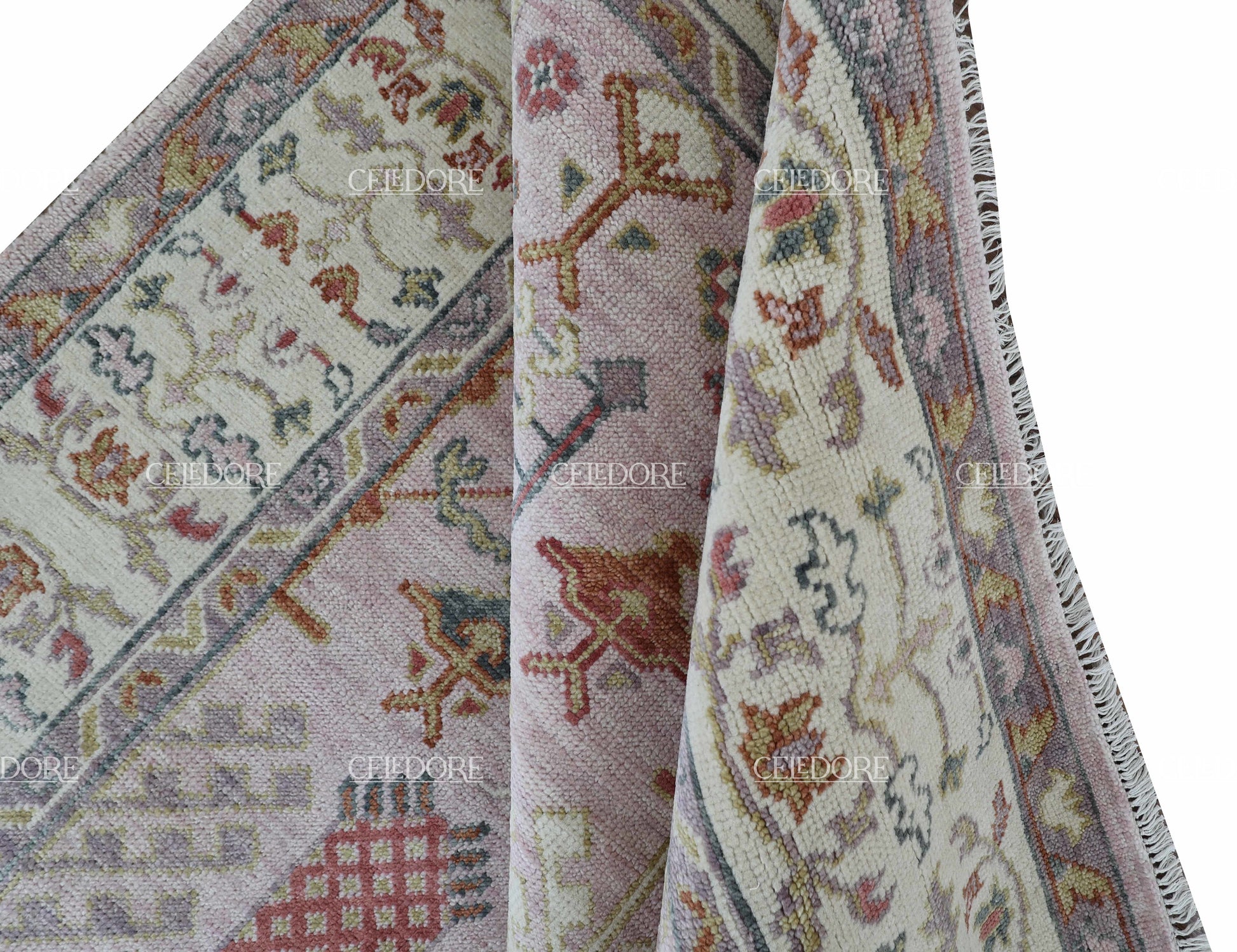 Hand-Knotted Oushak Rug, meticulously crafted with the finest quality wool. This rug embodies the rich tapestry of Indian craftsmanship, blending traditional design with a contemporary twist, reminiscent of the vibrant villages of India.