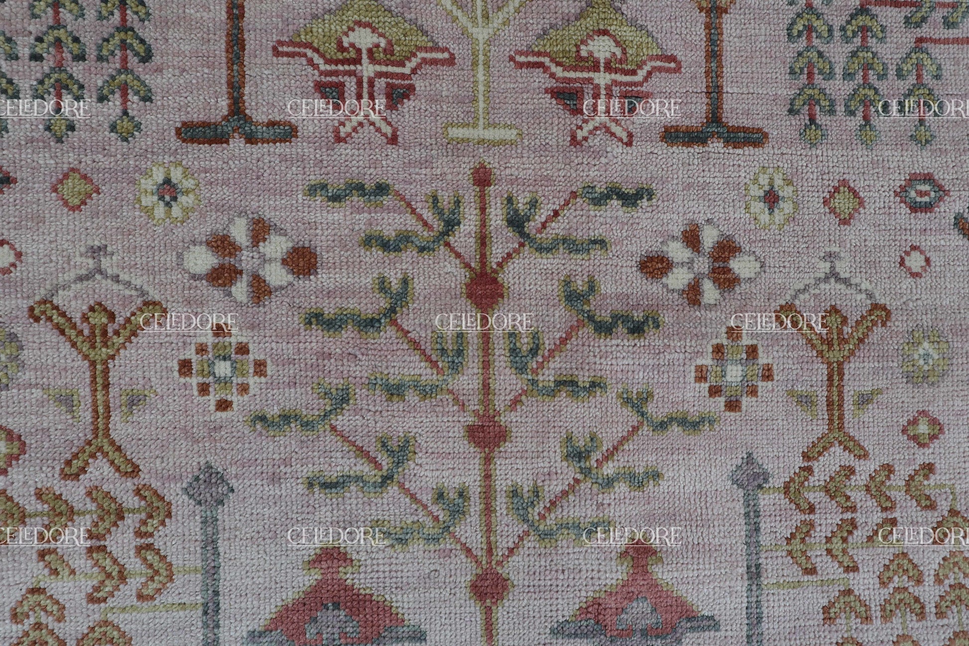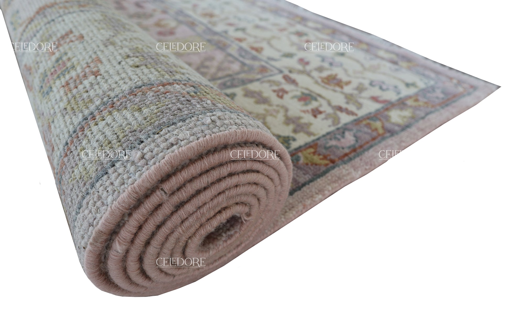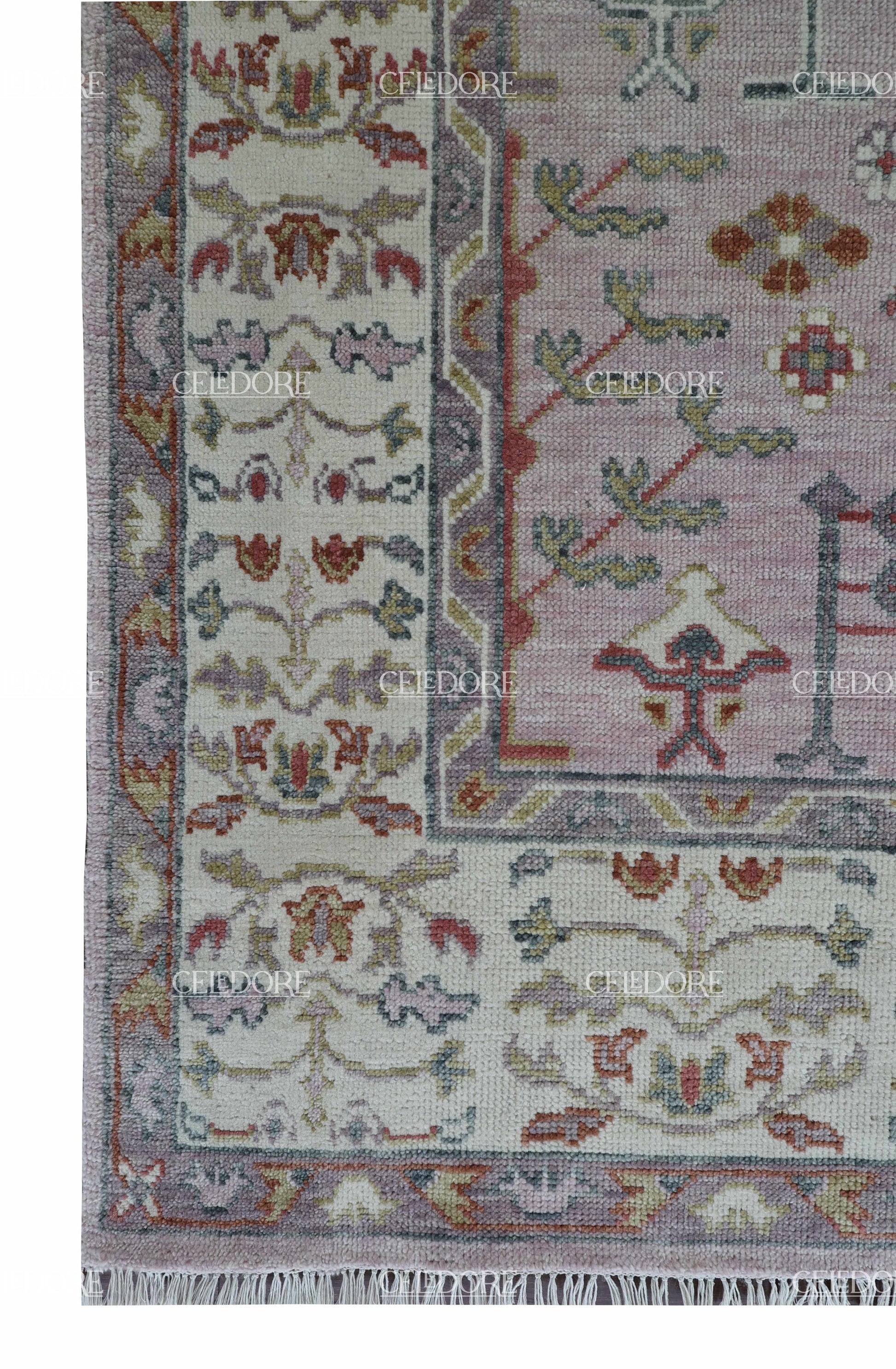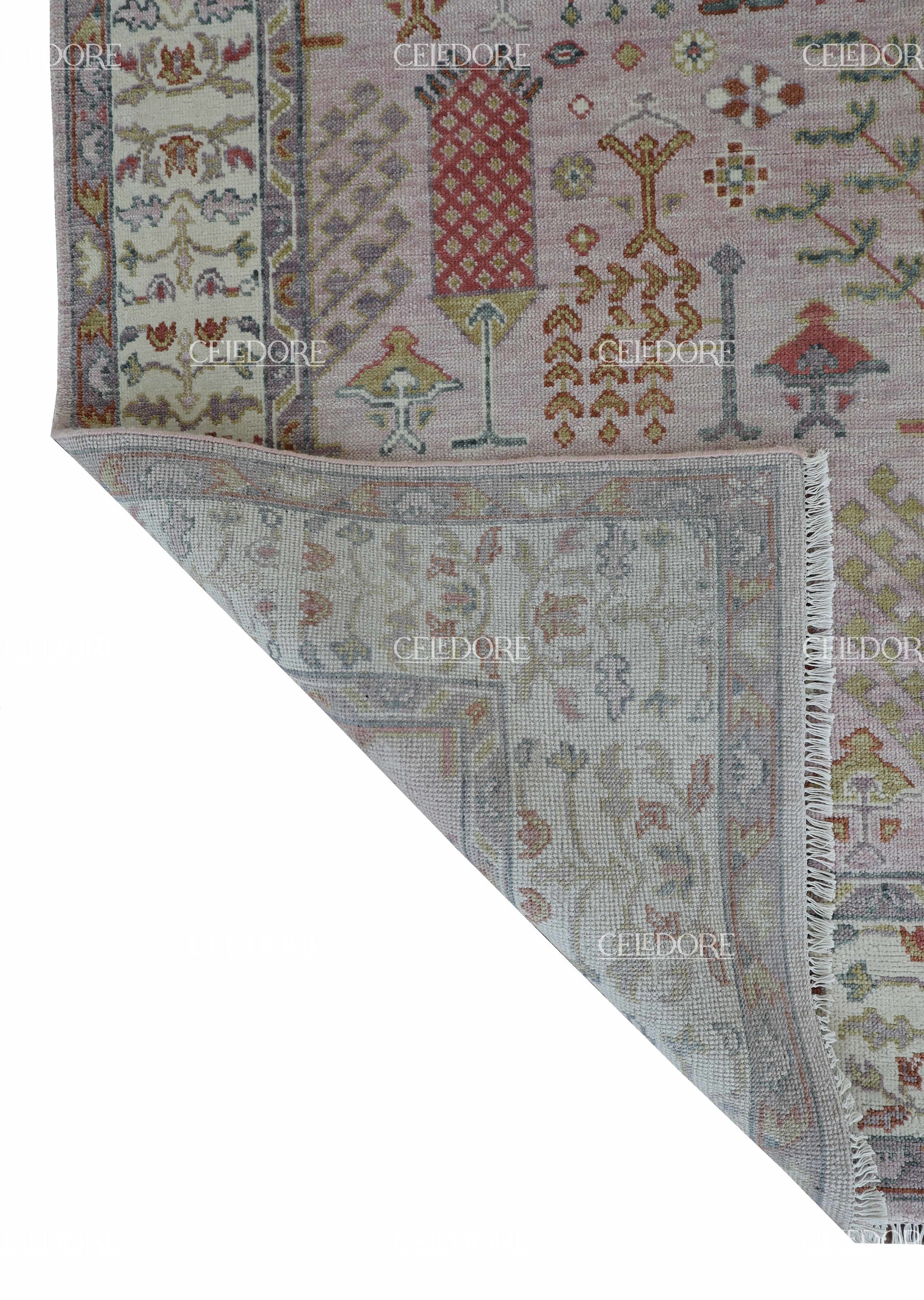 Hand-Knotted Oushak Rug, meticulously crafted with the finest quality wool. This rug embodies the rich tapestry of Indian craftsmanship, blending traditional design with a contemporary twist, reminiscent of the vibrant villages of India.