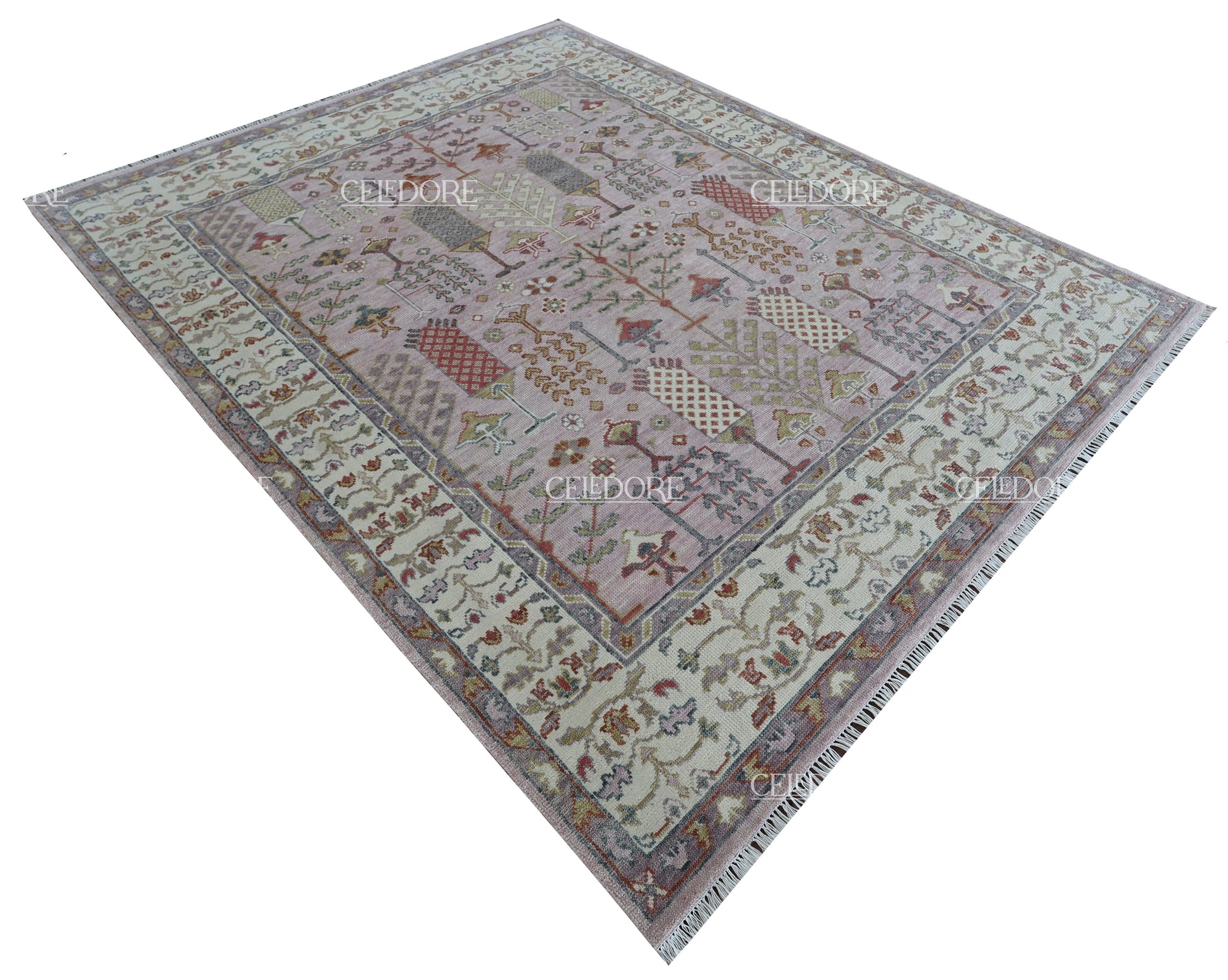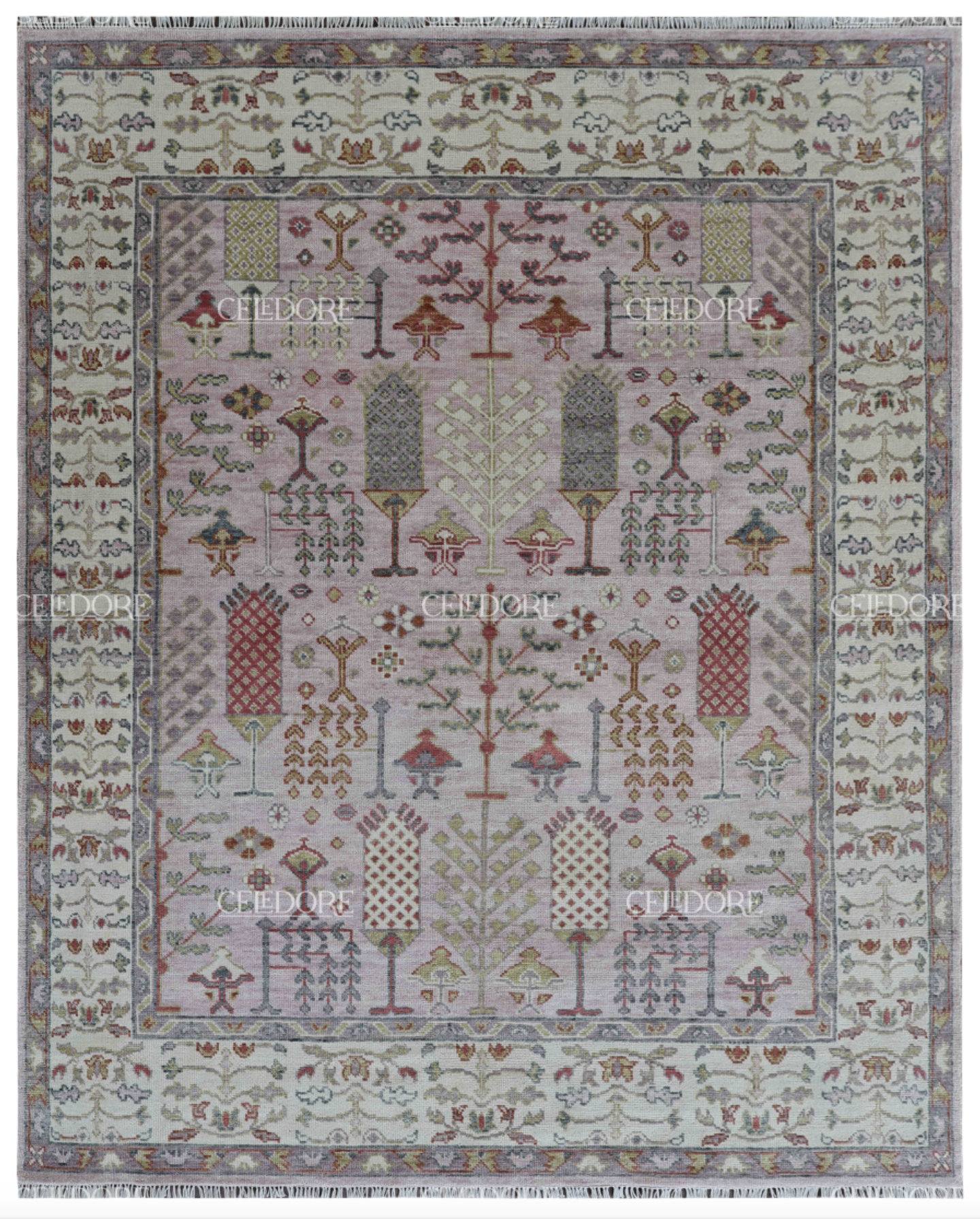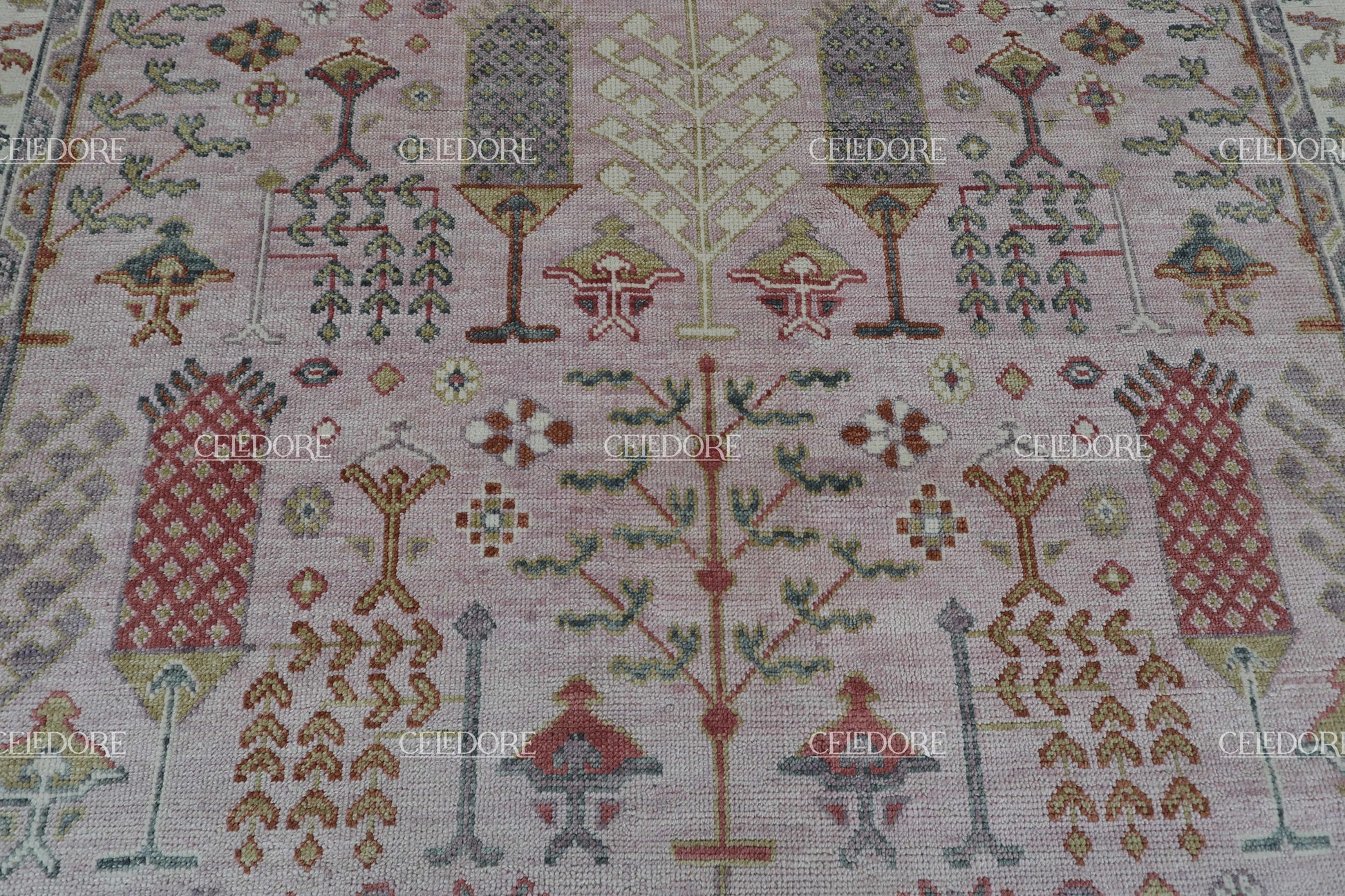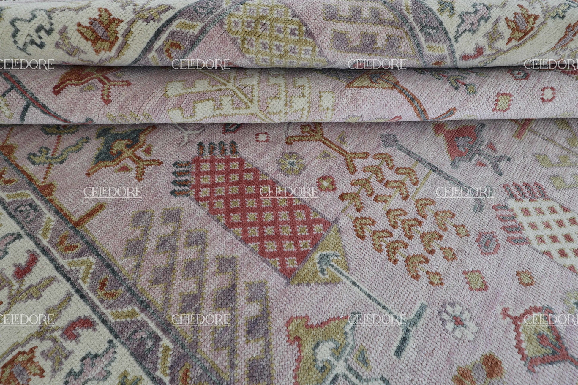 Hand-Knotted Oushak Rug, meticulously crafted with the finest quality wool. This rug embodies the rich tapestry of Indian craftsmanship, blending traditional design with a contemporary twist, reminiscent of the vibrant villages of India.