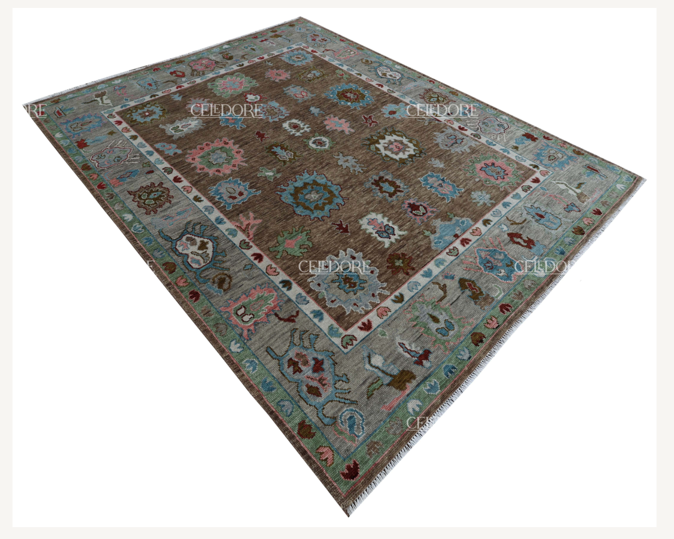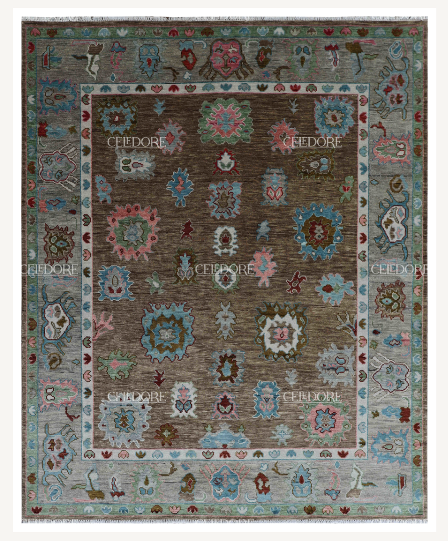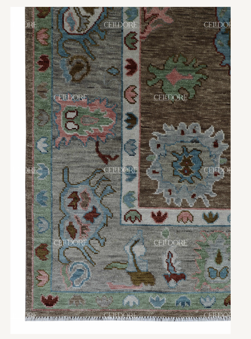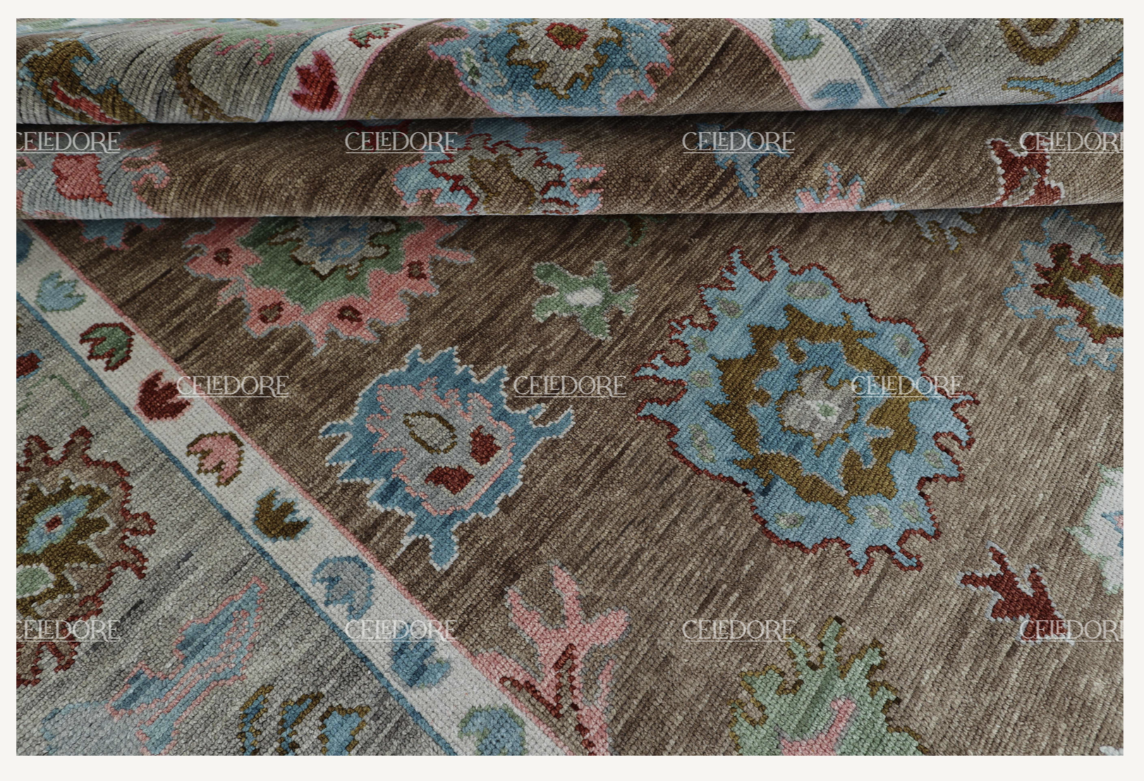 Hand-Knotted Oushak Rug, meticulously crafted with the finest quality wool. This rug embodies the rich tapestry of Indian craftsmanship, blending traditional design with a contemporary twist, reminiscent of the vibrant villages of India.