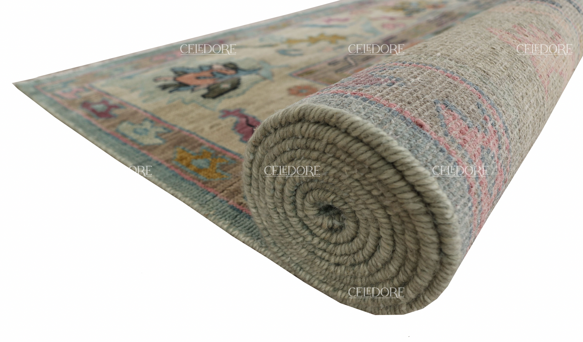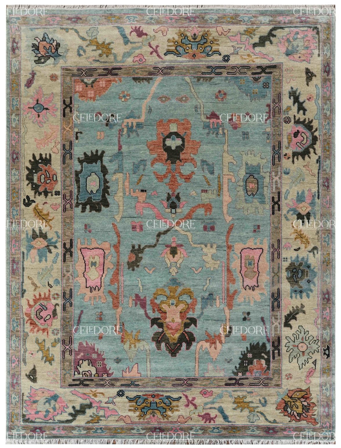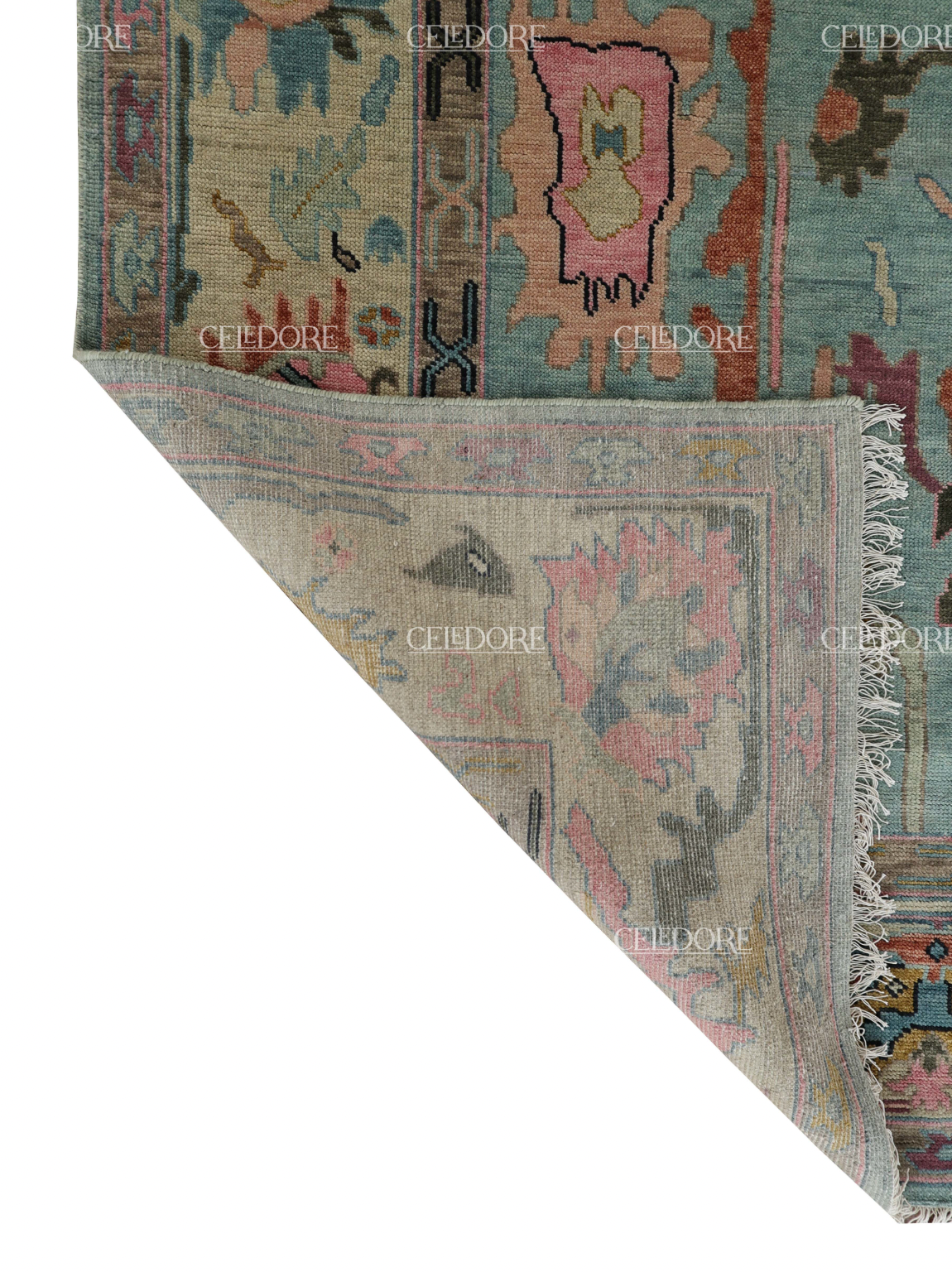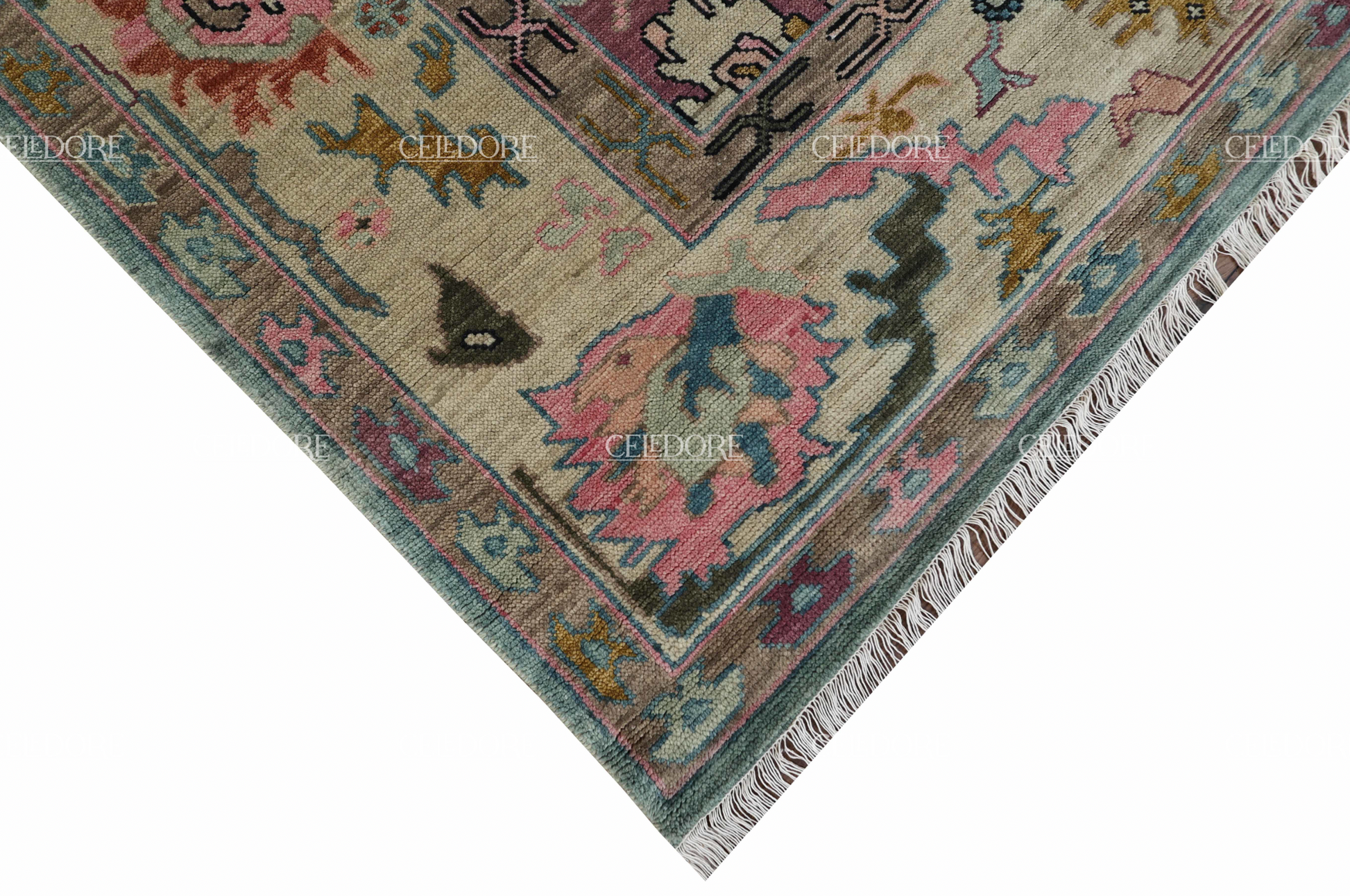 Hand-Knotted Oushak Rug, meticulously crafted with the finest quality wool. This rug embodies the rich tapestry of Indian craftsmanship, blending traditional design with a contemporary twist, reminiscent of the vibrant villages of India.