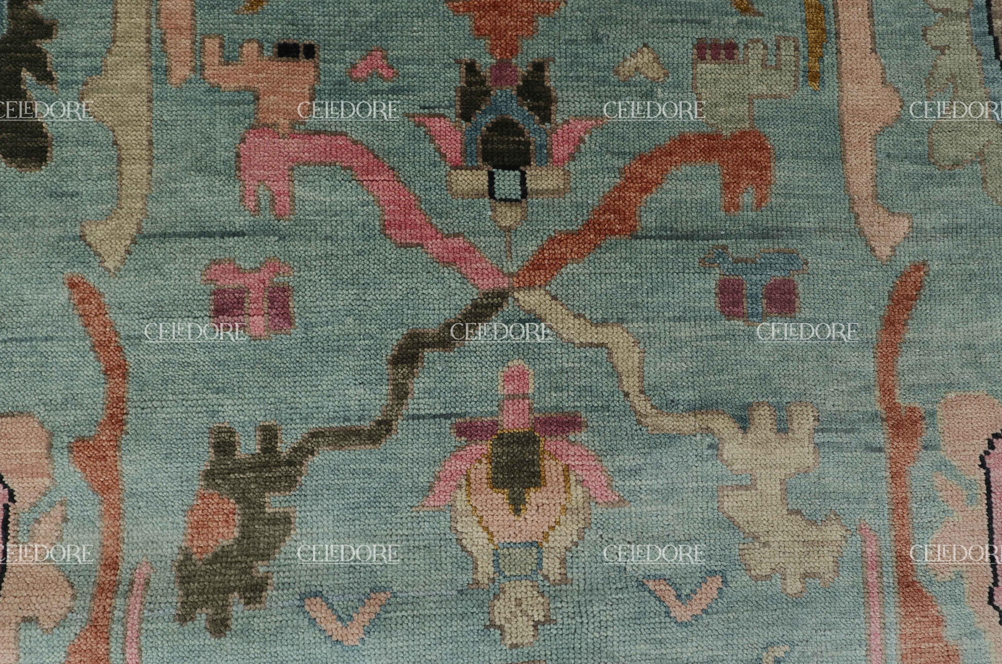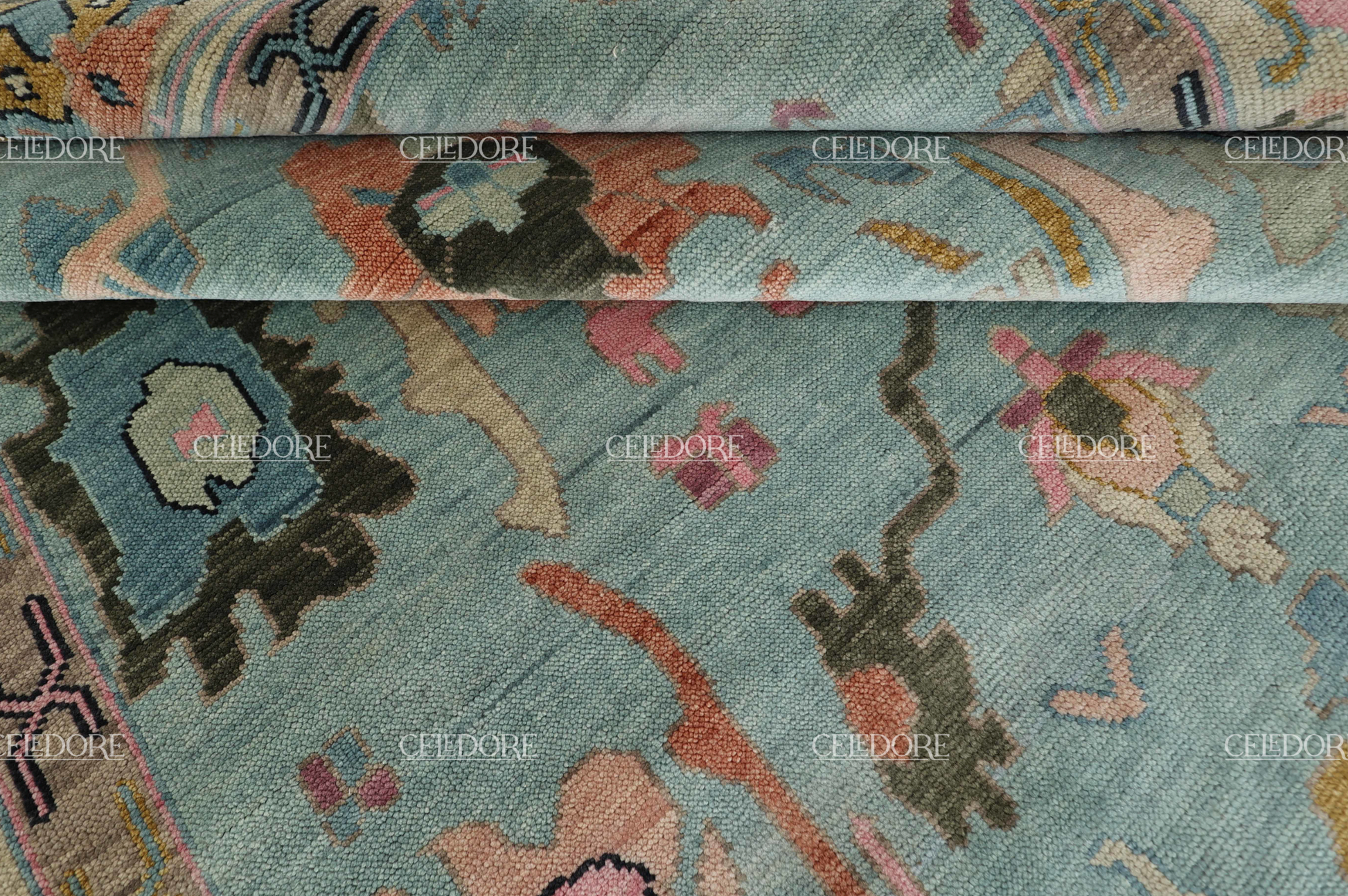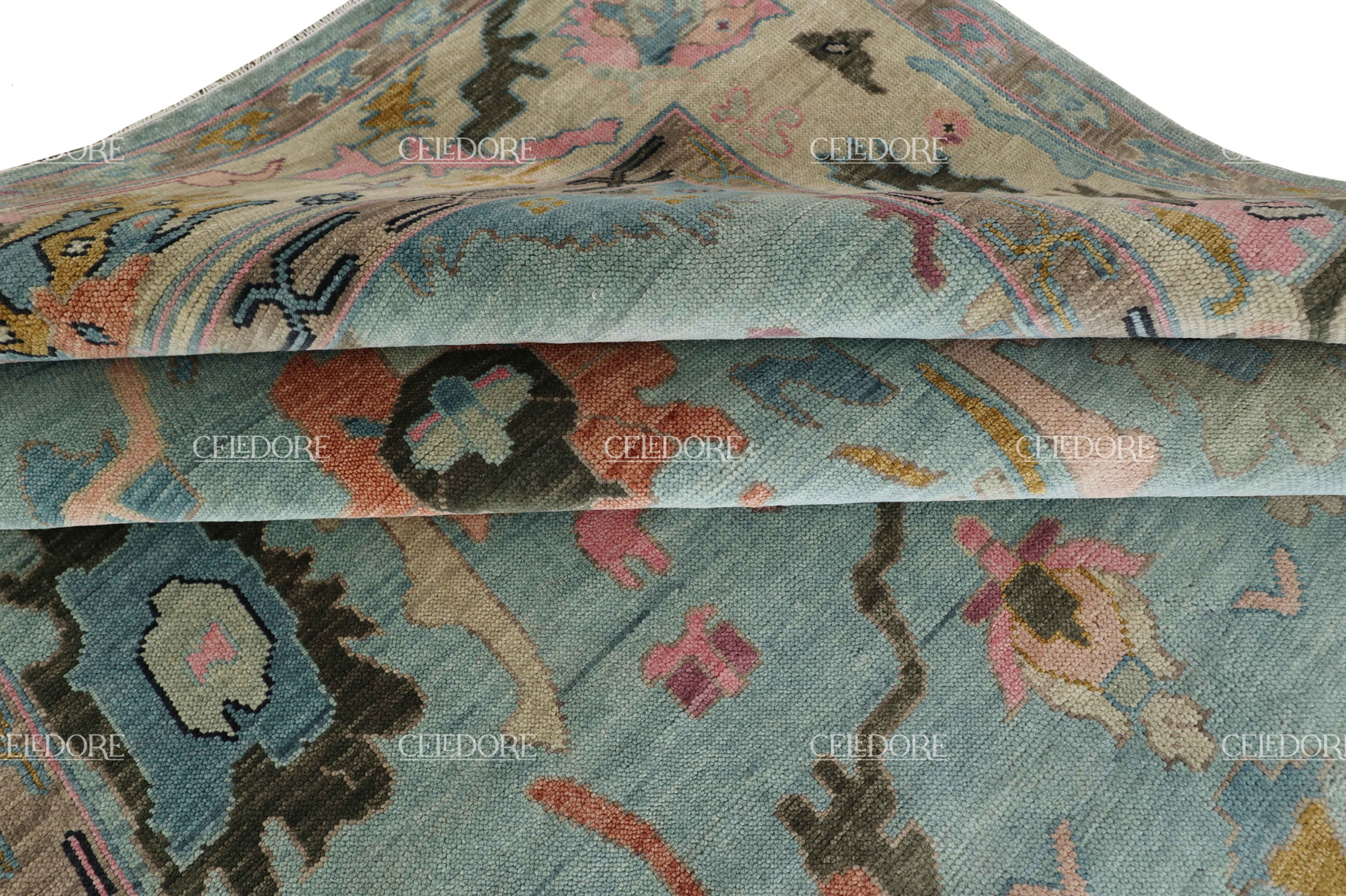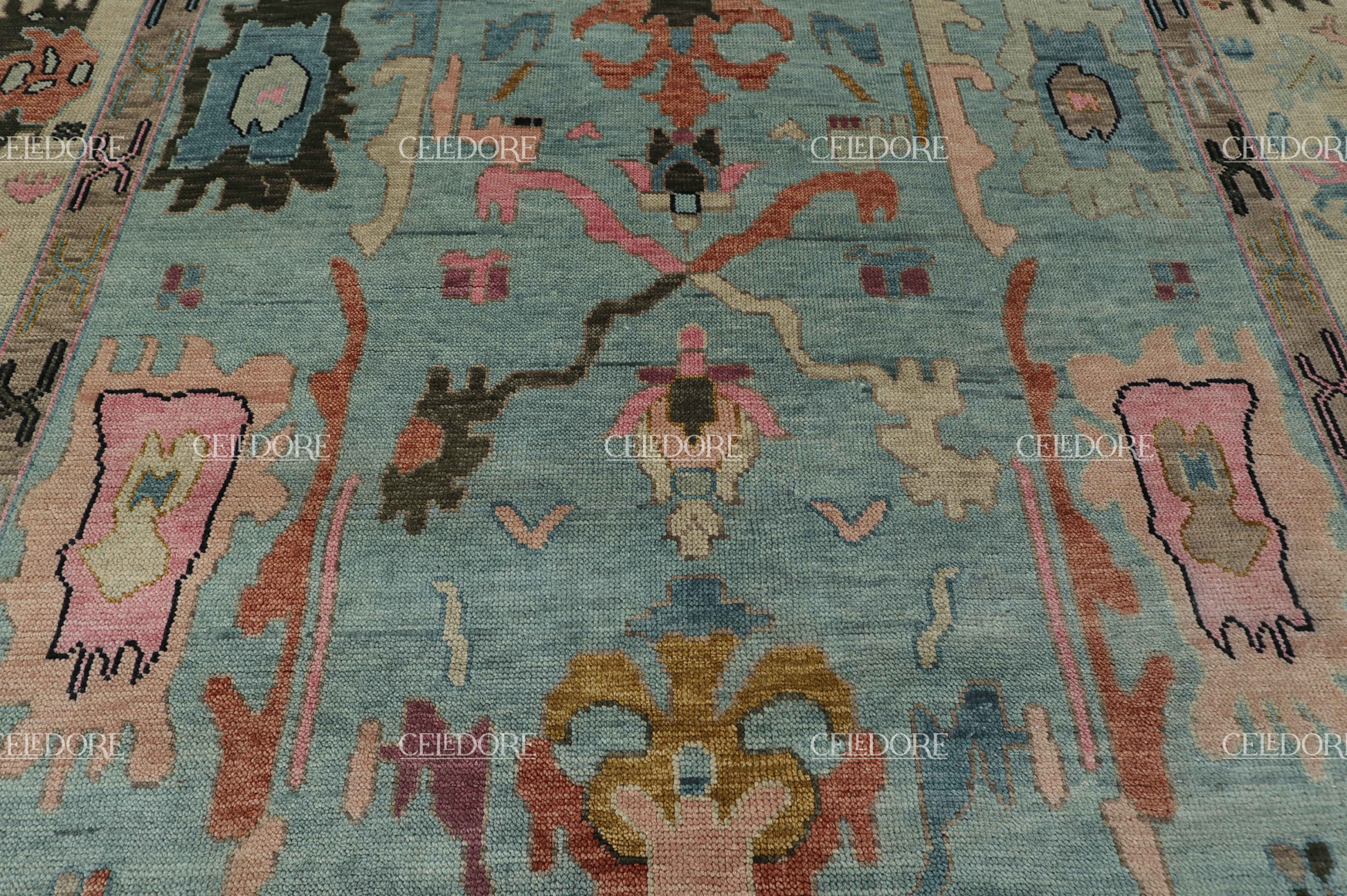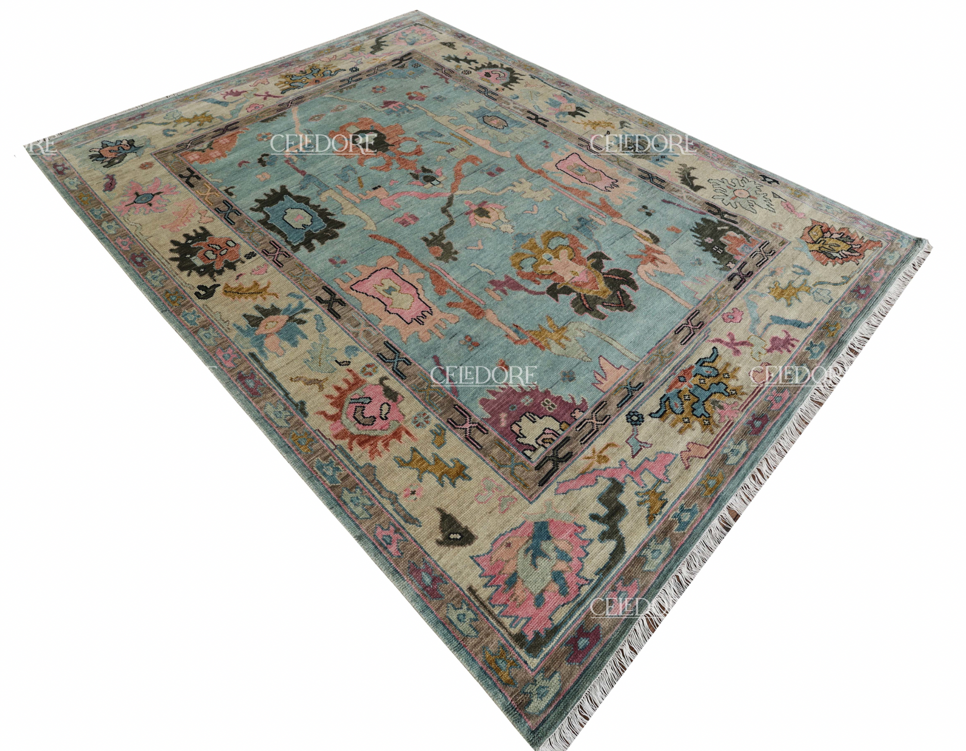 Hand-Knotted Oushak Rug, meticulously crafted with the finest quality wool. This rug embodies the rich tapestry of Indian craftsmanship, blending traditional design with a contemporary twist, reminiscent of the vibrant villages of India.