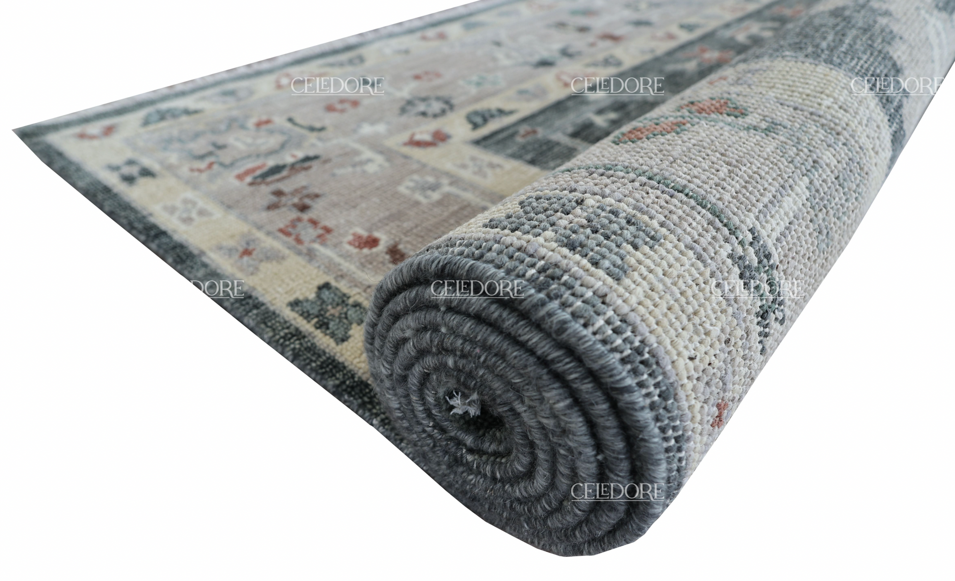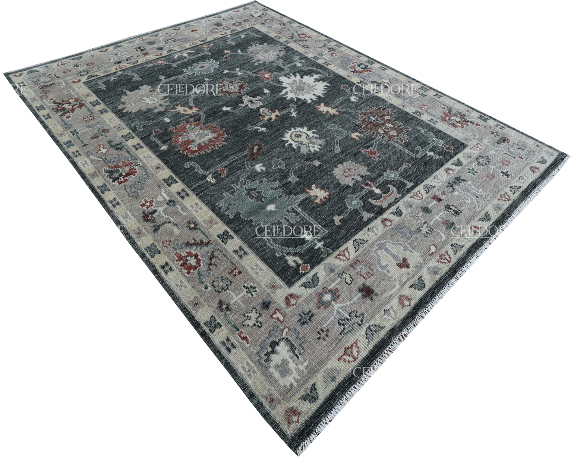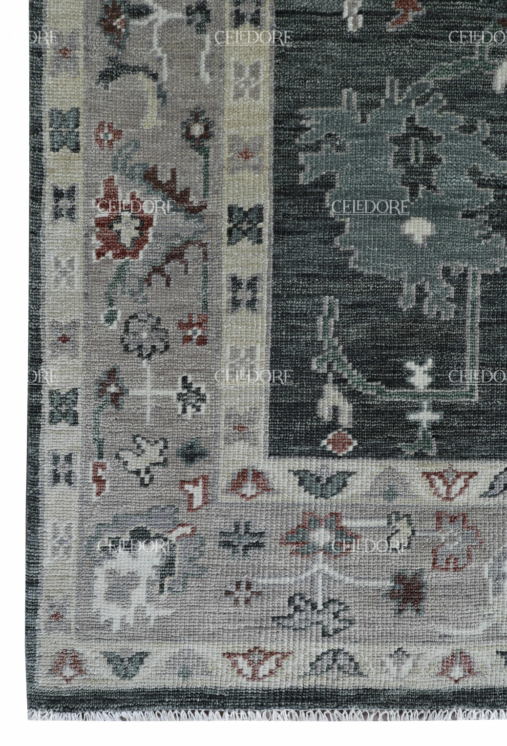 Hand-Knotted Oushak Rug, meticulously crafted with the finest quality wool. This rug embodies the rich tapestry of Indian craftsmanship, blending traditional design with a contemporary twist, reminiscent of the vibrant villages of India.