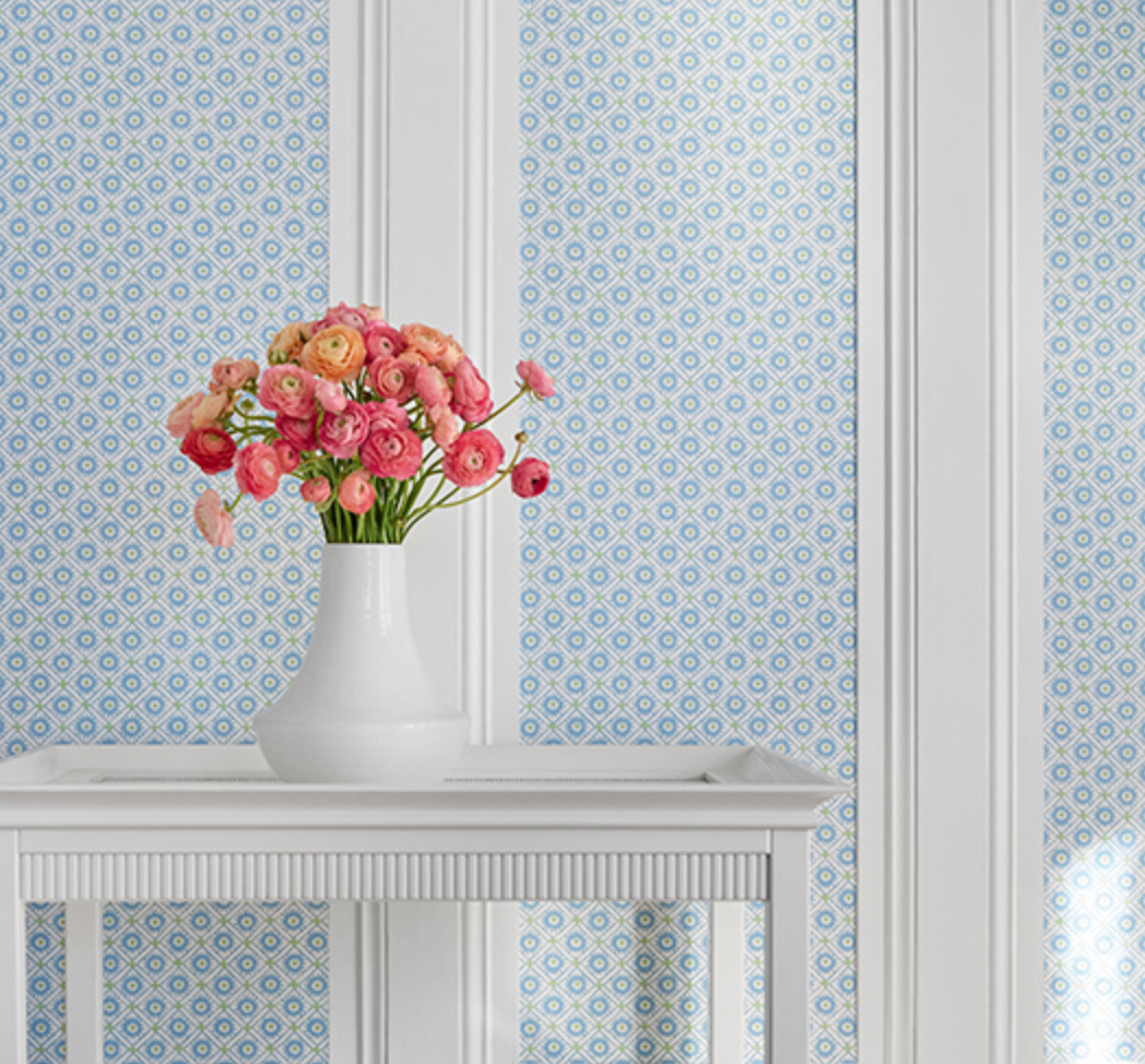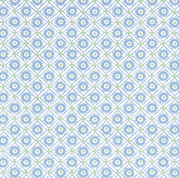 A charming print with loosely drawn sunburst motifs in six cheerful colors.